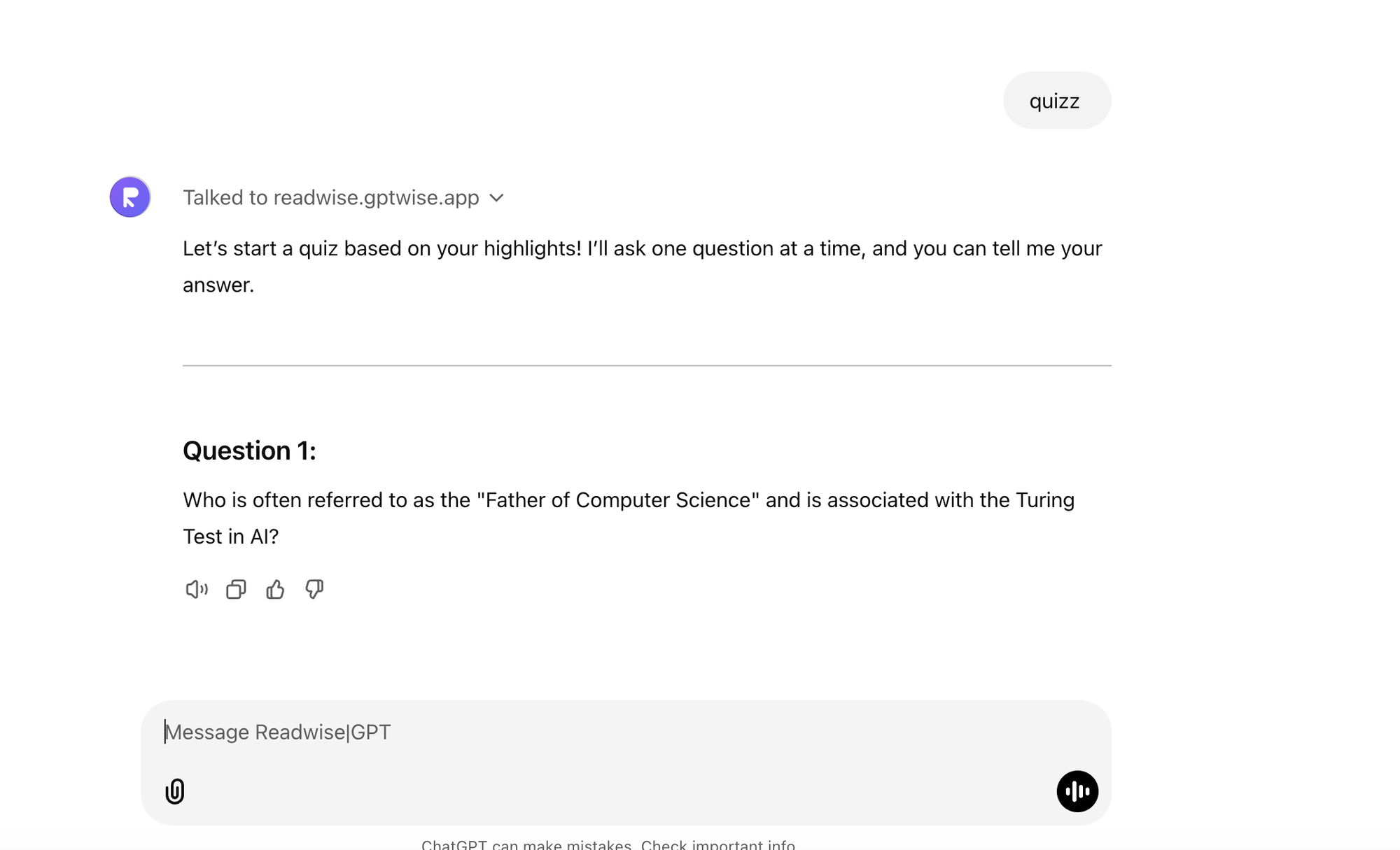 I simply open ReadwiseGPT and type quiz.