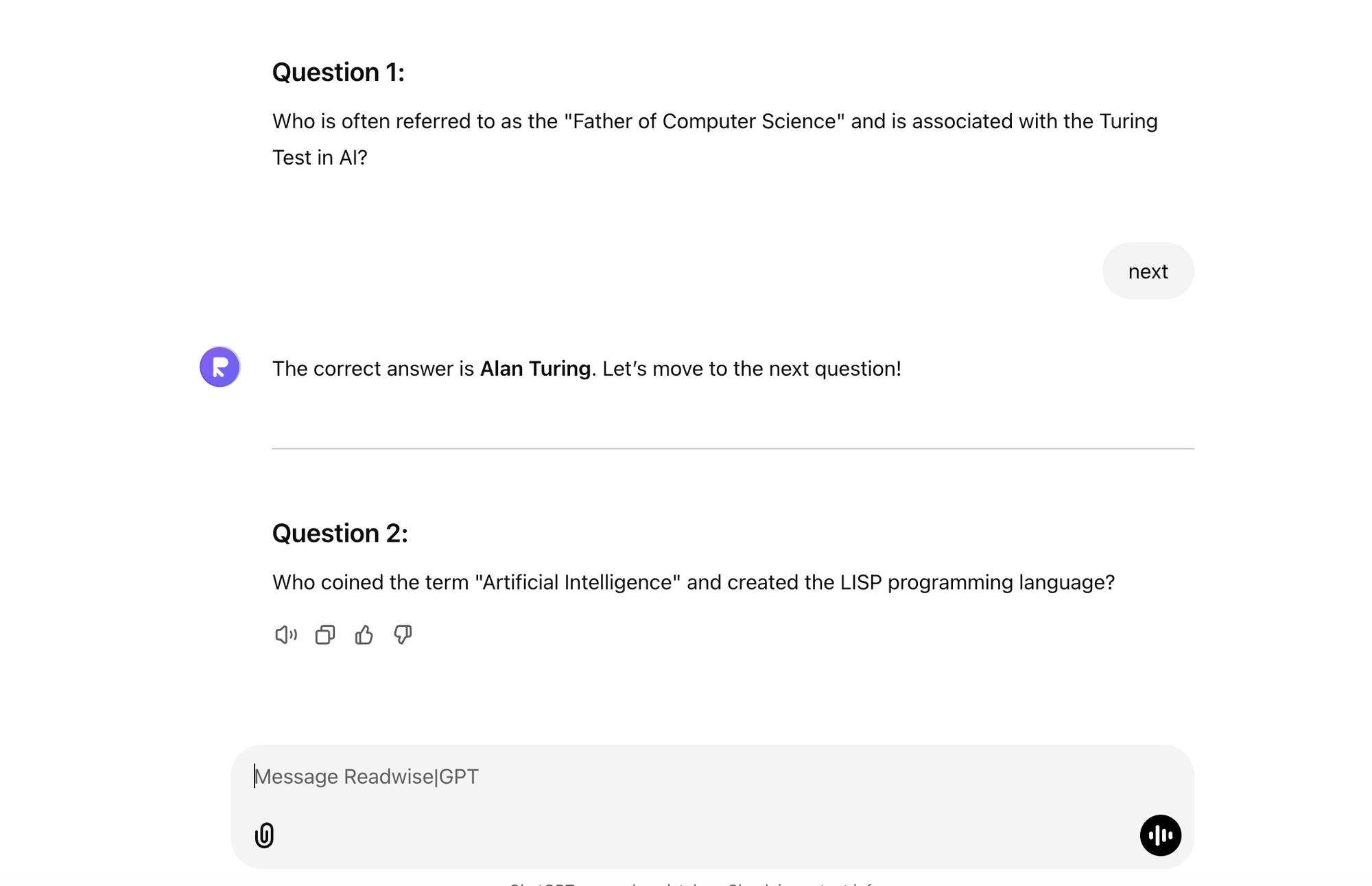 Now GPT starts asking me questions about previous highlights. In this case, I was asked about the most influential AI scientist of all time.