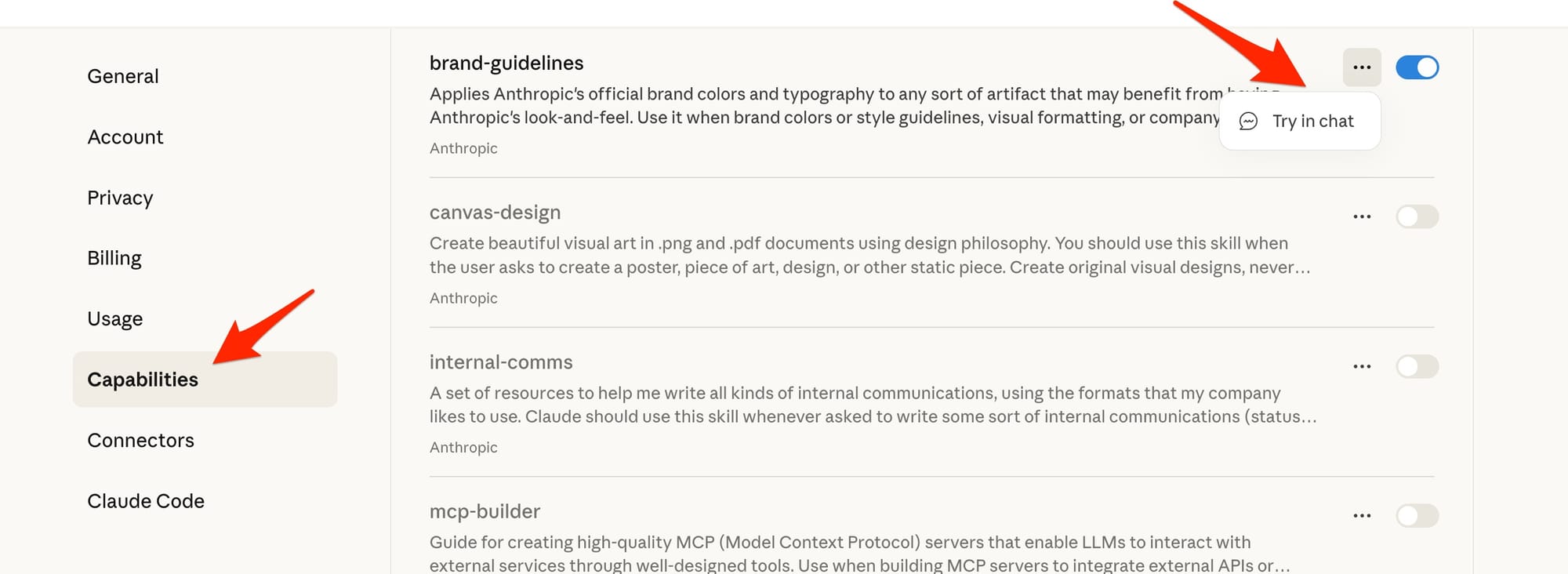 Let's say you work at a company with strict brand guidelines. Instead of repeatedly explaining your color palette, typography, and tone of voice with every request, you can create a Brand Guidelines Skill. Upload it once, and Claude automatically applies your standards to any artifact it creates.