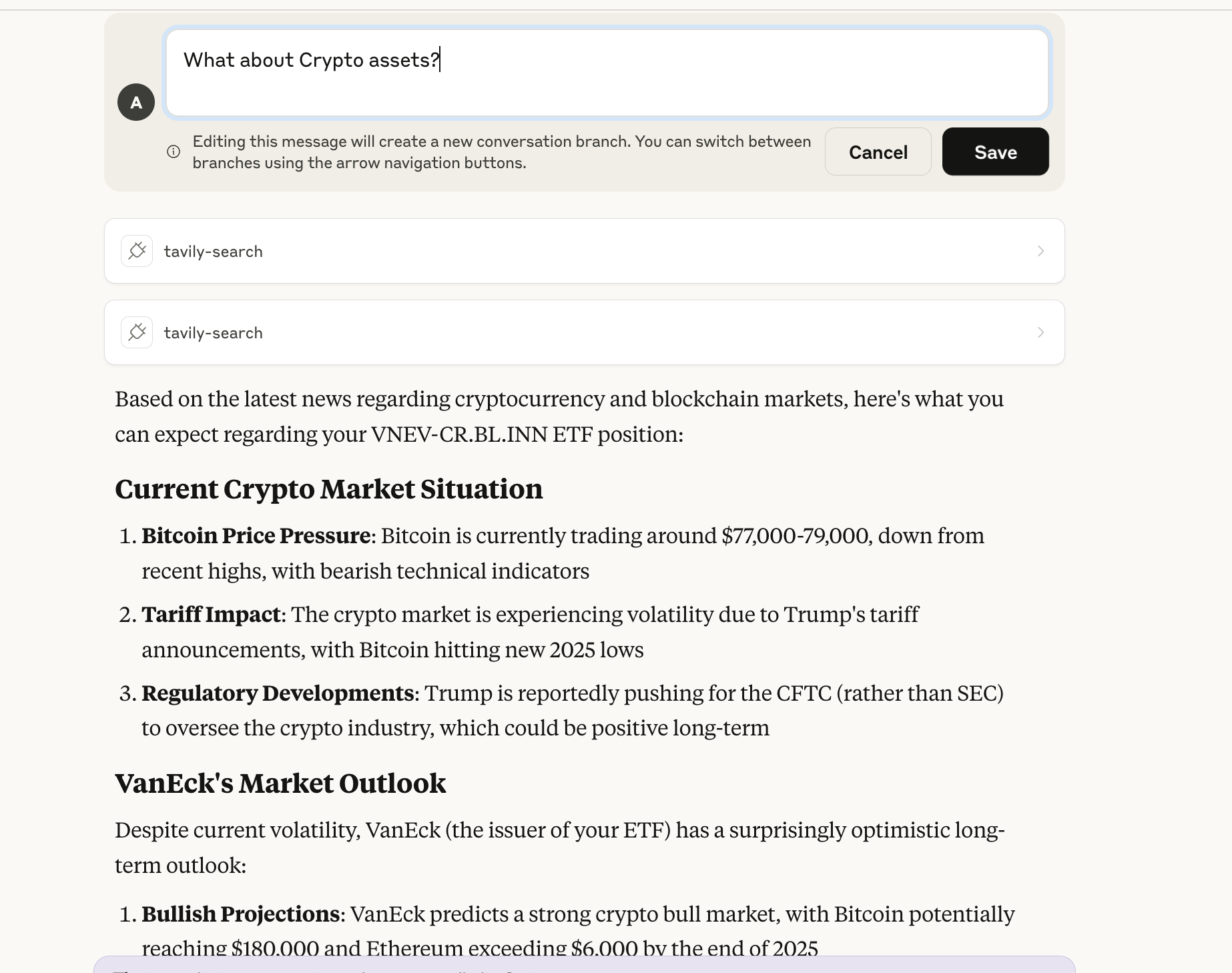 Now Claude will interpret your uploaded portfolio and use the provided tools as necessary (yfinance and the news search).