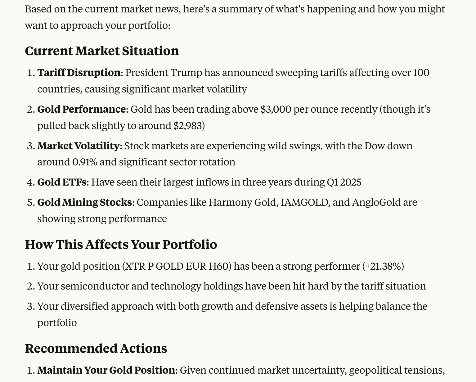 Here is a sample recommendation after Claude notices that the market is currently influenced by tariffs (and of course, it knows your portfolio as well).