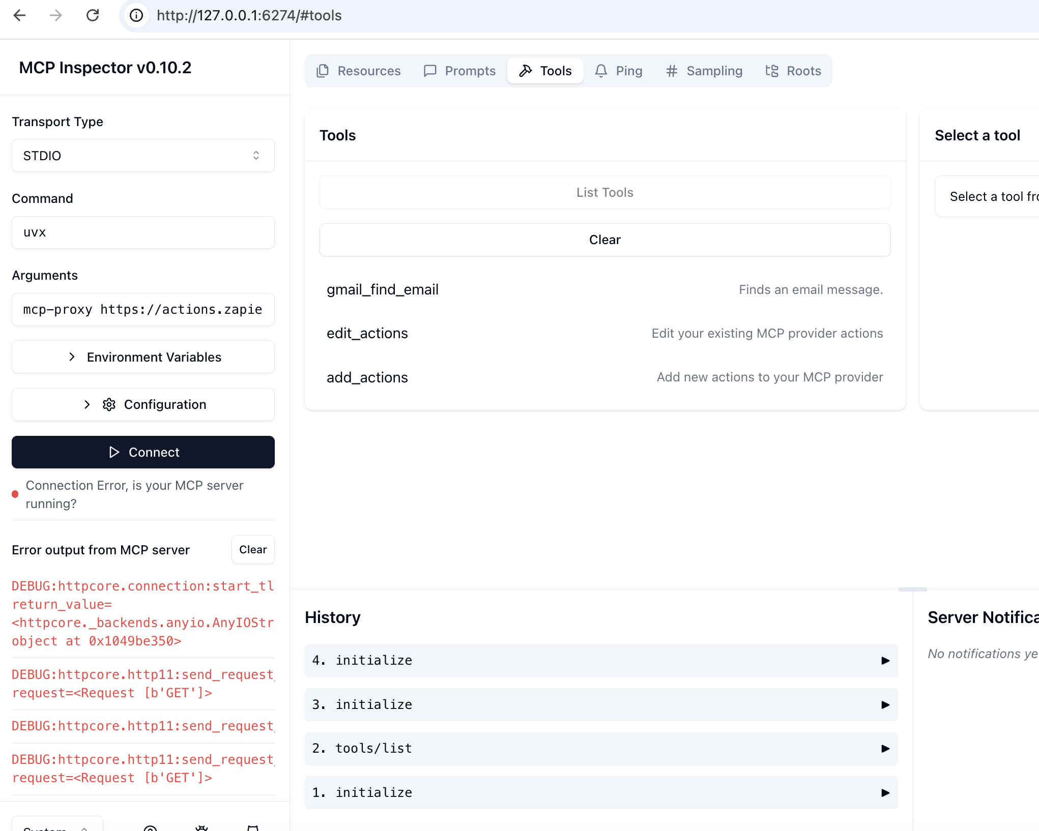 And as you can see, it shows gmailfindemail from the Zapier MCP as expected