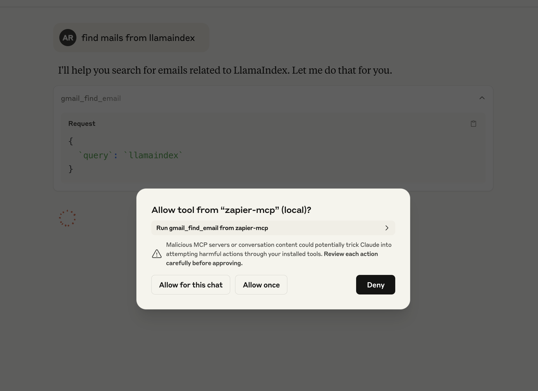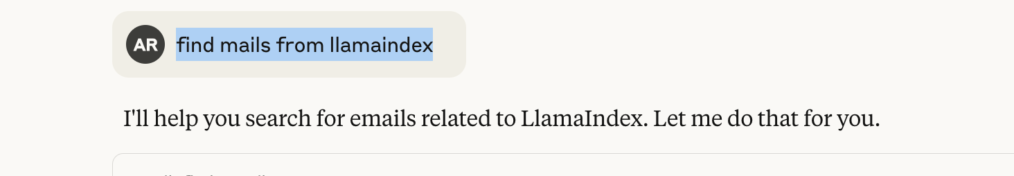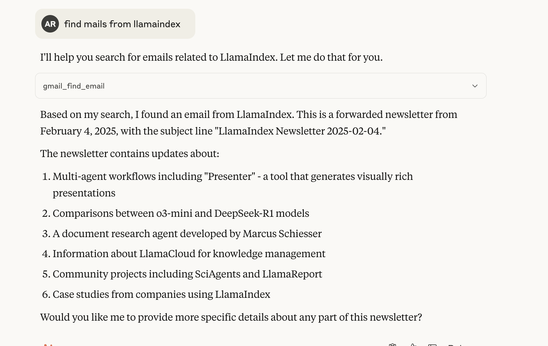 It connects to the tool (in this case Gmail), searches for "llamaindex" and a few seconds later shows what it has found. Amazing.
