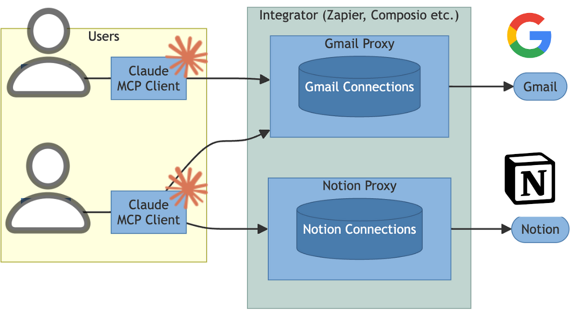Claude > Secure Service/MCP Server (manages OAuth token after initiated) > the target service (e.g., Google Mail)