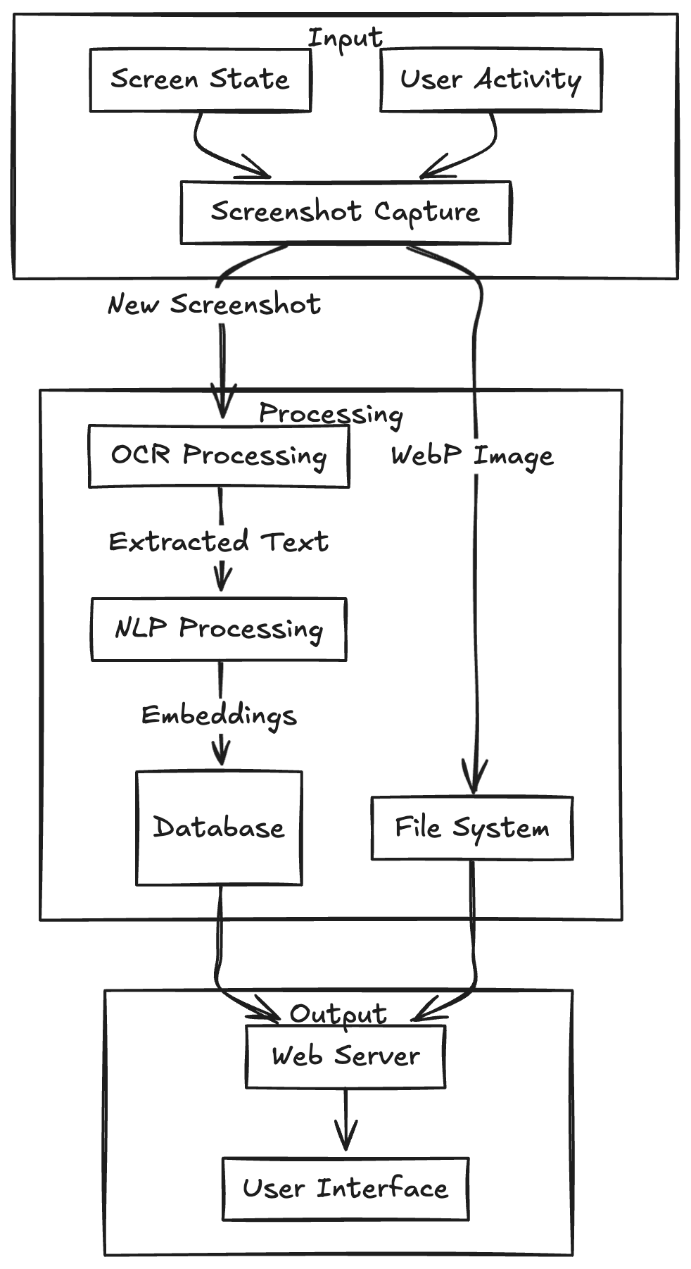 OpenRecall is an intelligent system designed to capture and make searchable your digital activities. Its architecture is meticulously crafted to ensure modularity, maintainability, and efficiency. Below is a comprehensive breakdown of its system architecture and components.