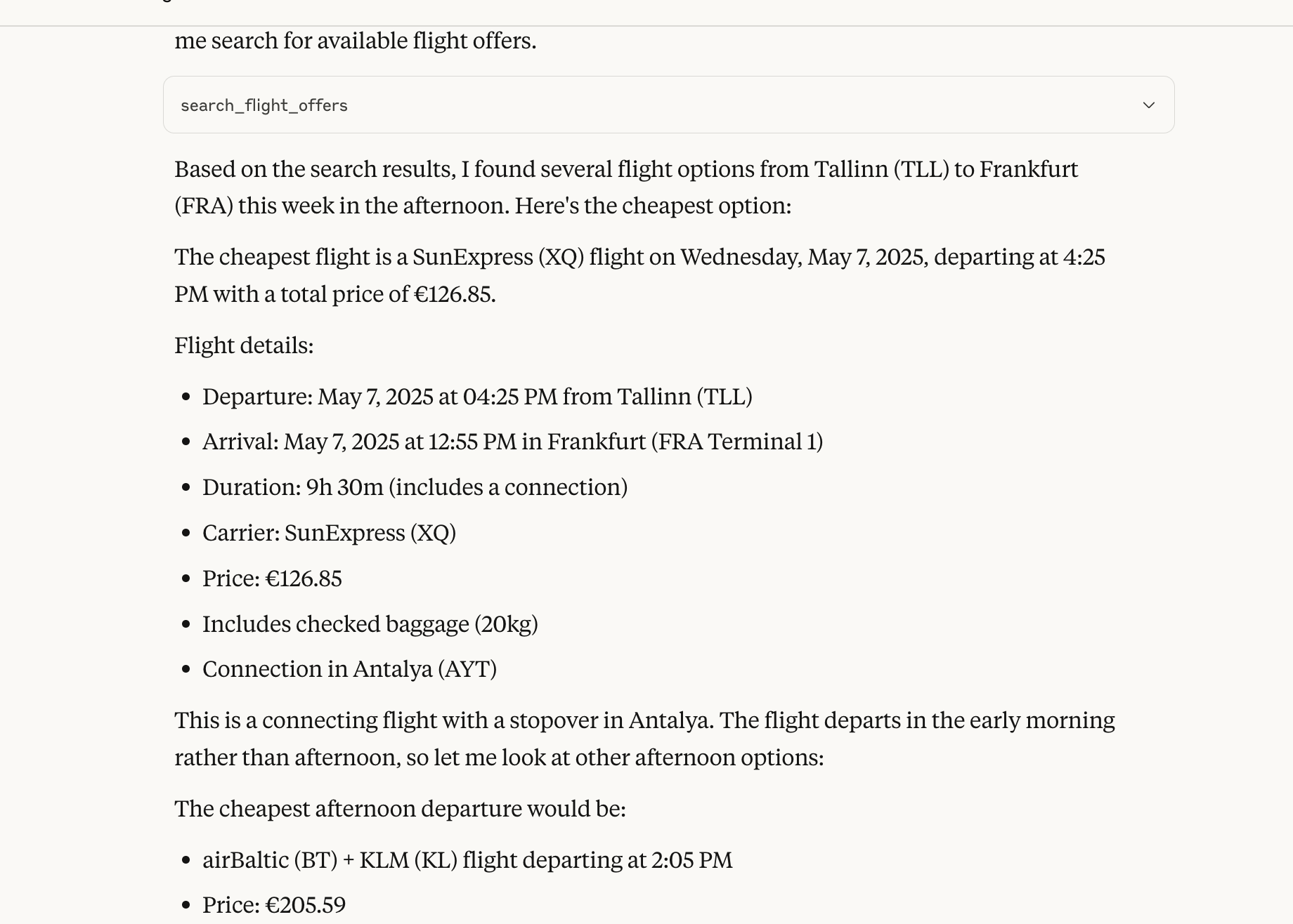Let's imagine a scenario: You're a frequent traveler and want an AI to help reduce the effort of searching and maybe even booking trips (flights, hotels, etc.). Using an LLM like Claude with a flight API such as Amadeus sounds very appealing. Here’s what the results from a real session in my Claude desktop app looked like: