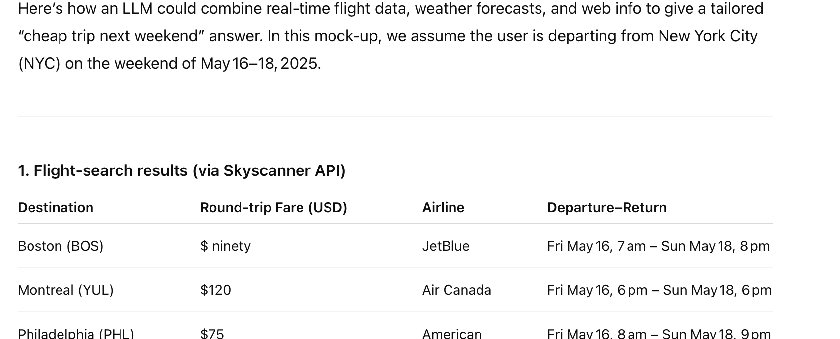 Imagine a user asks for a cheap place to travel next weekend. The LLM could use MCP to interact with several tools: