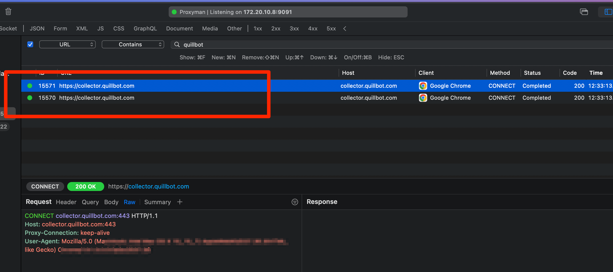 In Proxyman, I activated a filter for the QuillBot extension and optionally enabled the interception of HTTPS responses, as shown below: