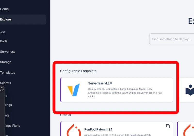 Select "Serverless vLLM". We're using this because it's optimized for running large language models and provides an OpenAI-compatible API, which we need for AnythingLLM integration.