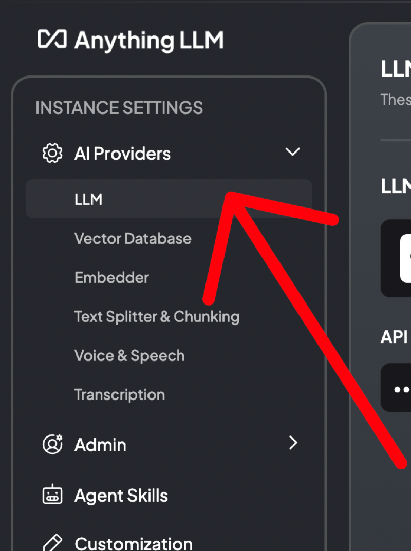 In settings, go to AI Providers and select "LLM". This is where you tell AnythingLLM about your custom model.
