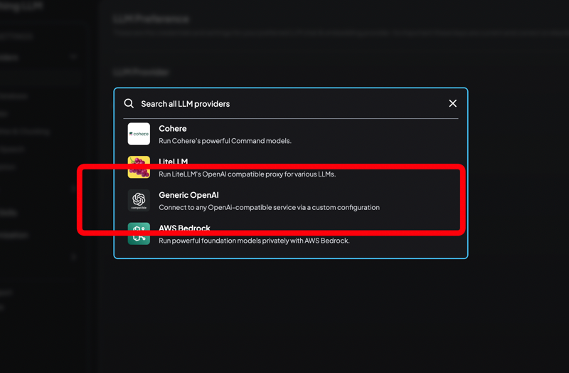 Choose "Generic OpenAI" as the provider. This option allows AnythingLLM to communicate with your RunPod-deployed model using the OpenAI-compatible API.