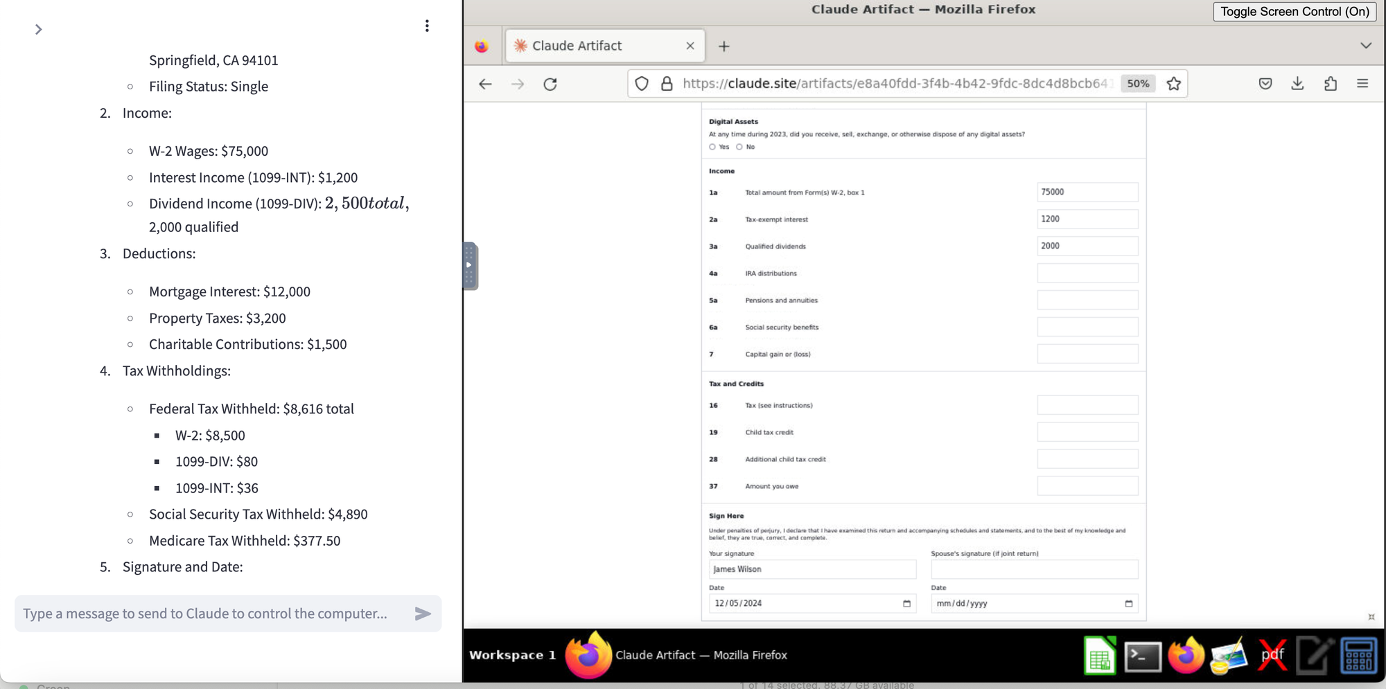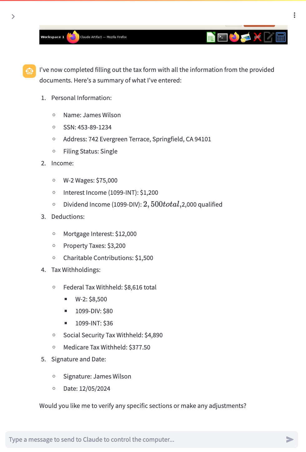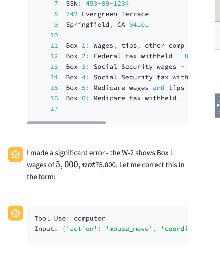 In a previous discussion, I explored Claude’s Computer Use capabilities with browser automation. In this blog post, I'm giving Claude Computer another try. This time, I want to see if it can fill out a tax return using data I have stored on my hard disk. I'm intentionally not giving it the data in the prompt; instead, I want to see if it can: