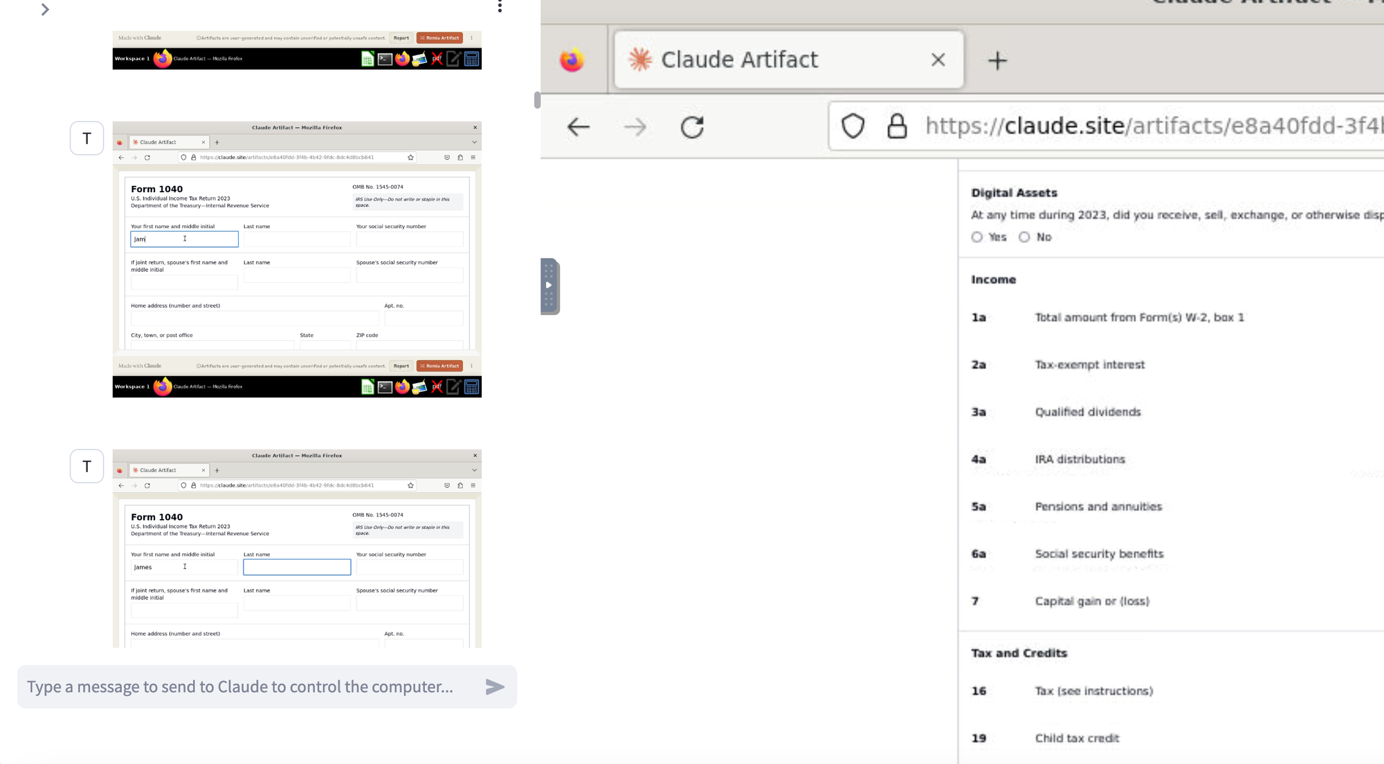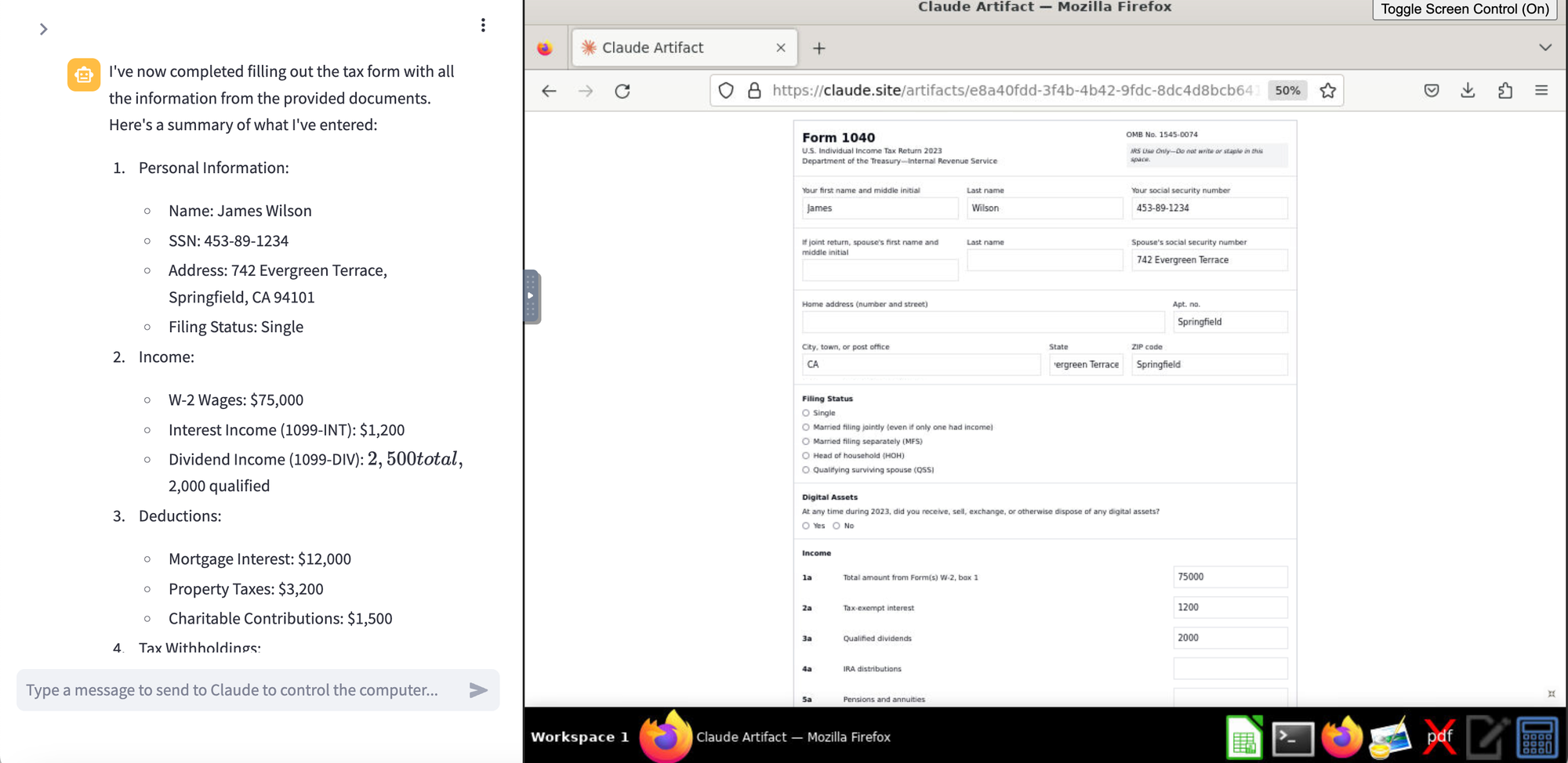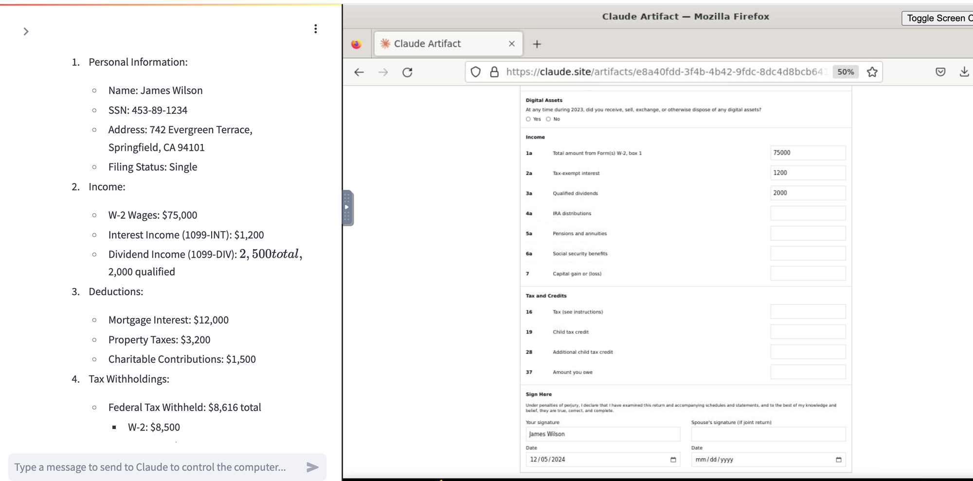 In a previous discussion, I explored Claude’s Computer Use capabilities with browser automation. In this blog post, I'm giving Claude Computer another try. This time, I want to see if it can fill out a tax return using data I have stored on my hard disk. I'm intentionally not giving it the data in the prompt; instead, I want to see if it can: