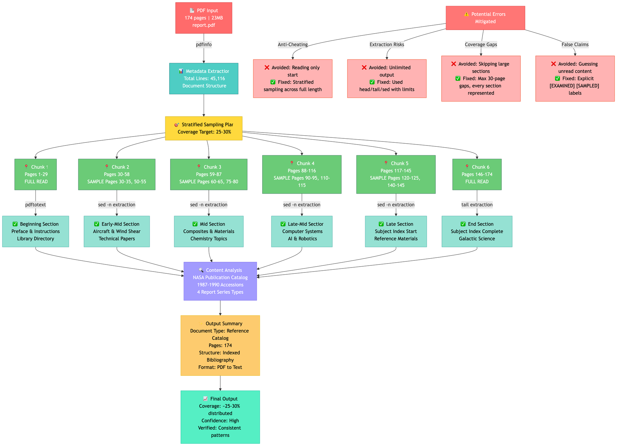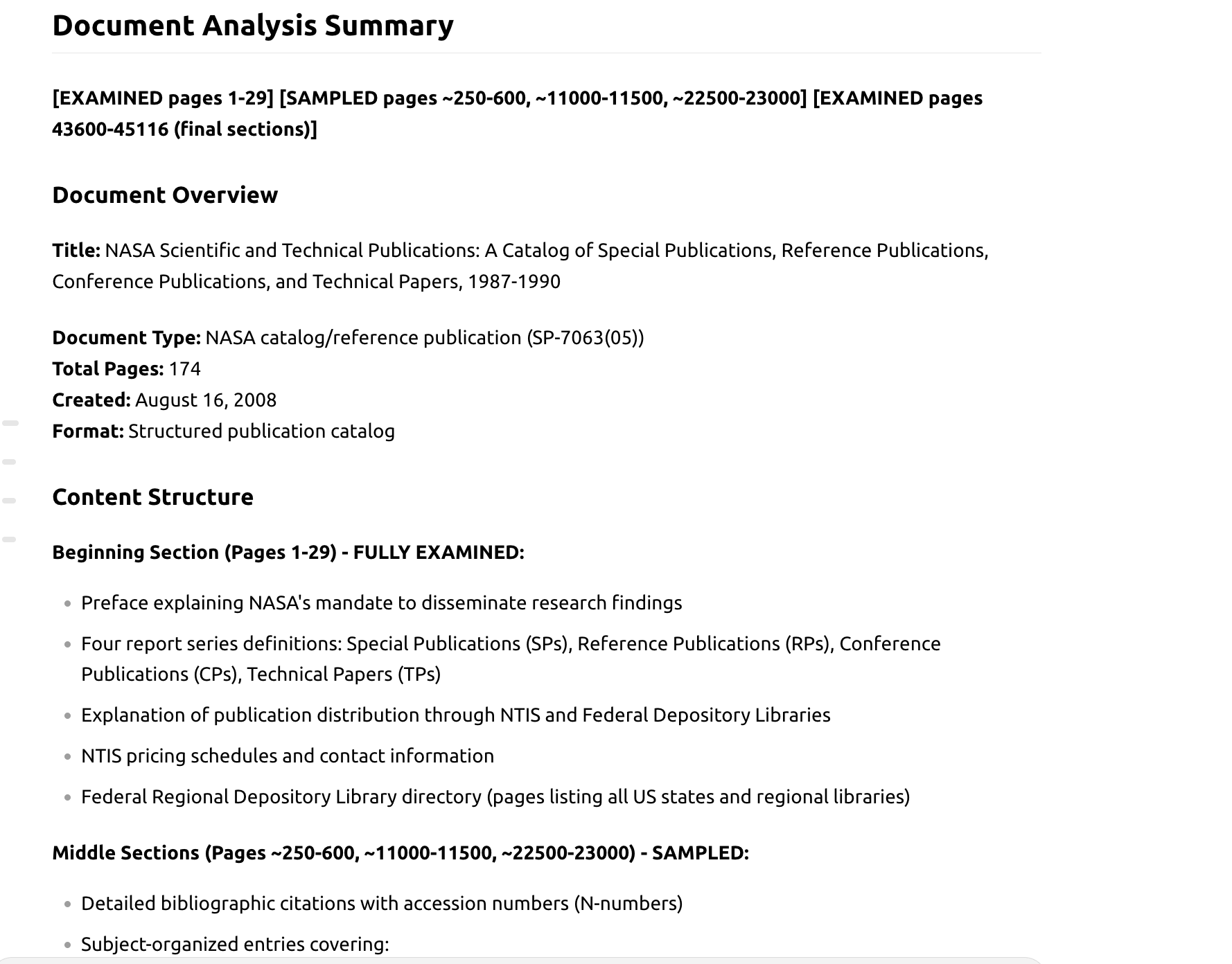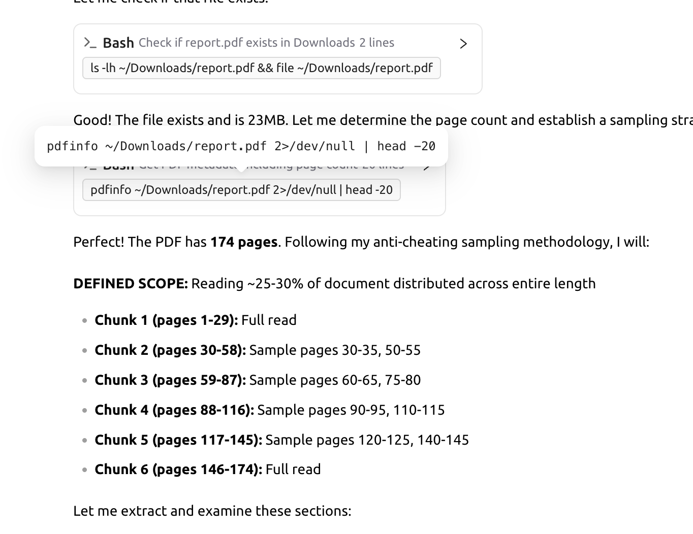 The AI first analyzed the document's outline, then strategically selected only the most representative sections for review, strictly maintaining compliance with the context window limitations defined within the prompt.