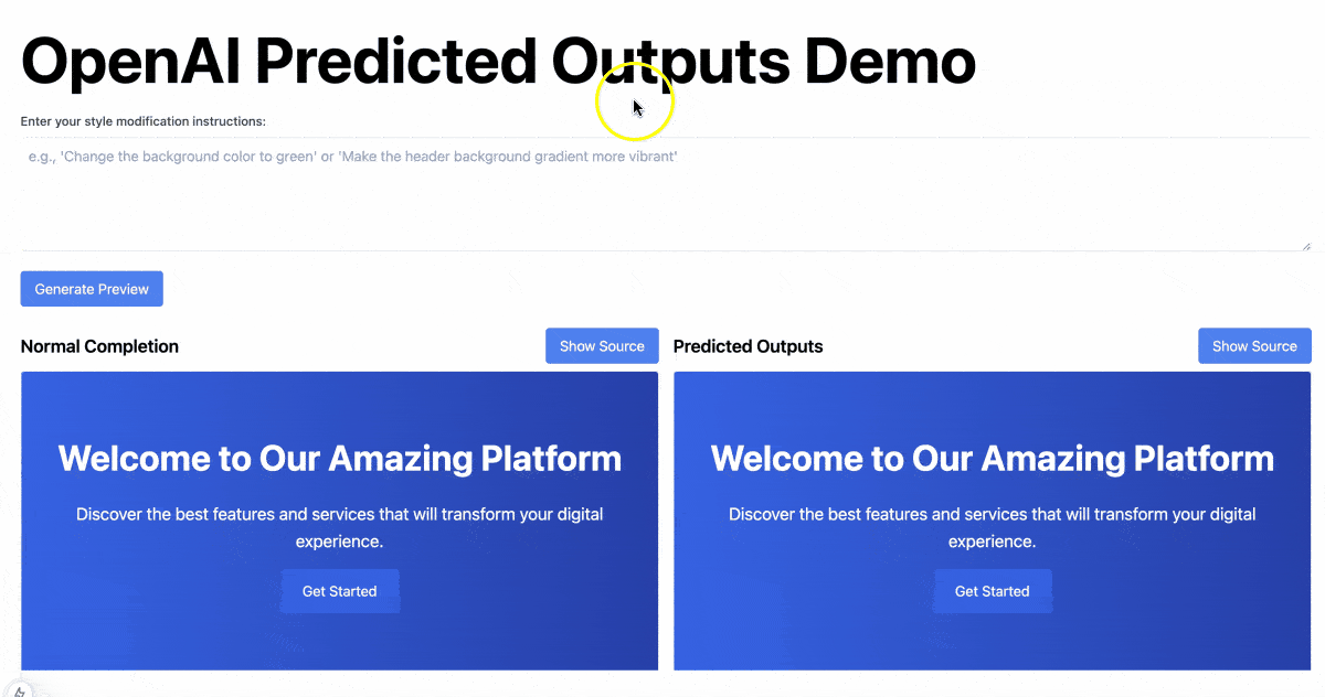 In this second example, we completely change the styling and content of the page. This represents a case where Predicted Outputs offers minimal benefit since most content needs to change.