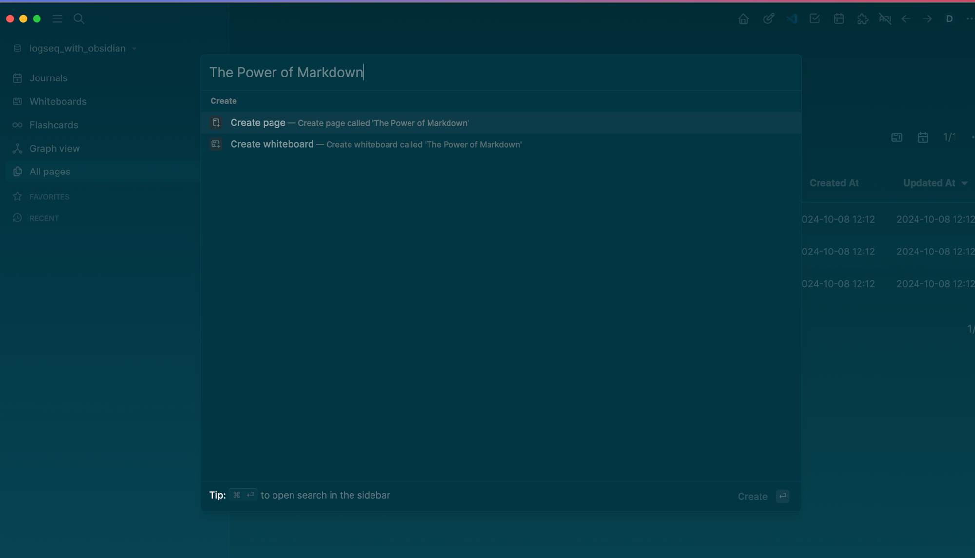Now let's try it the other way around: create a page in Obsidian and make sure it becomes visible also in Logseq.