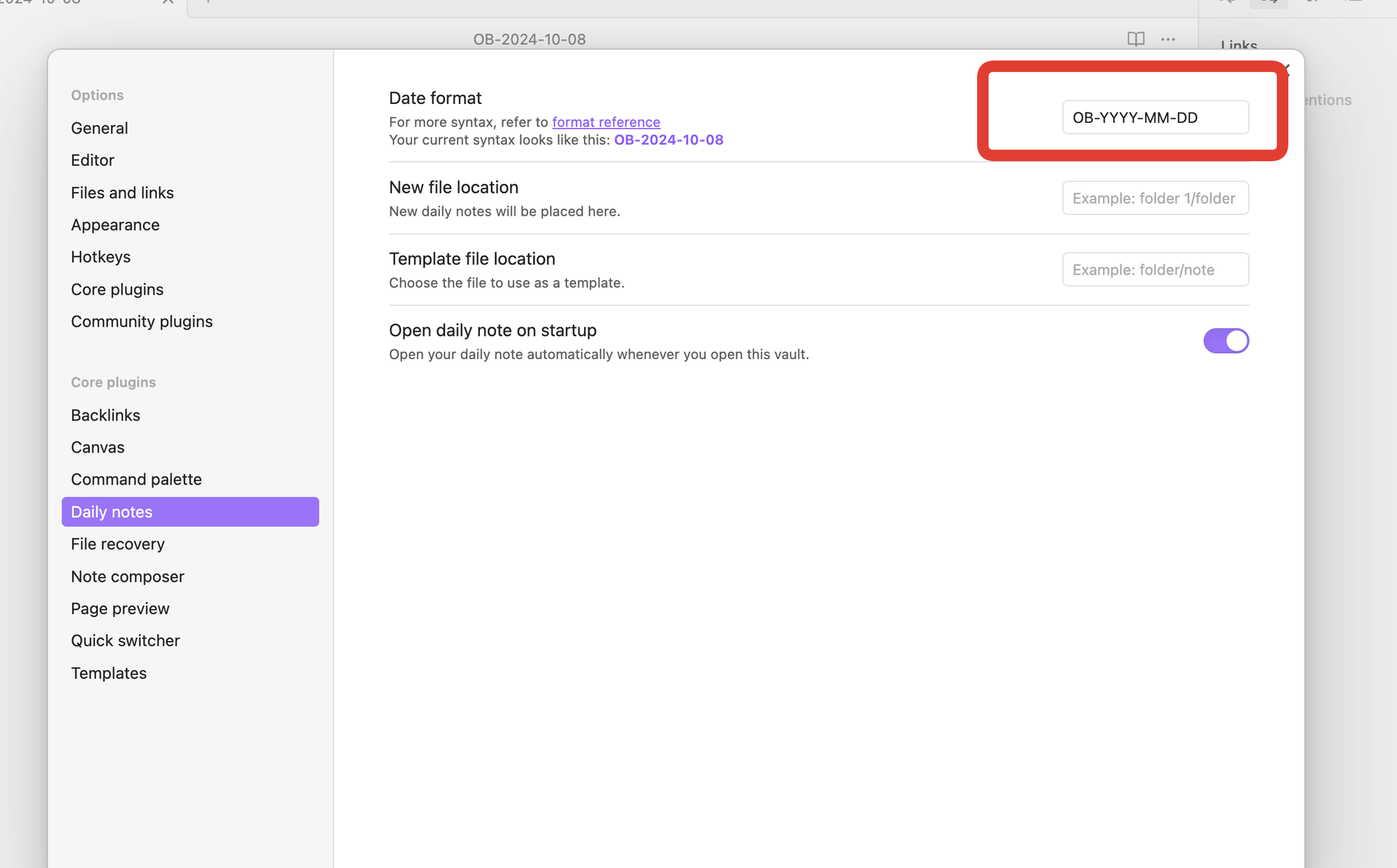 In the screenshot below, I changed it to OB-YYYY-MM-DD (as opposed to the default pattern used by both apps, YYYY-MM-DD).