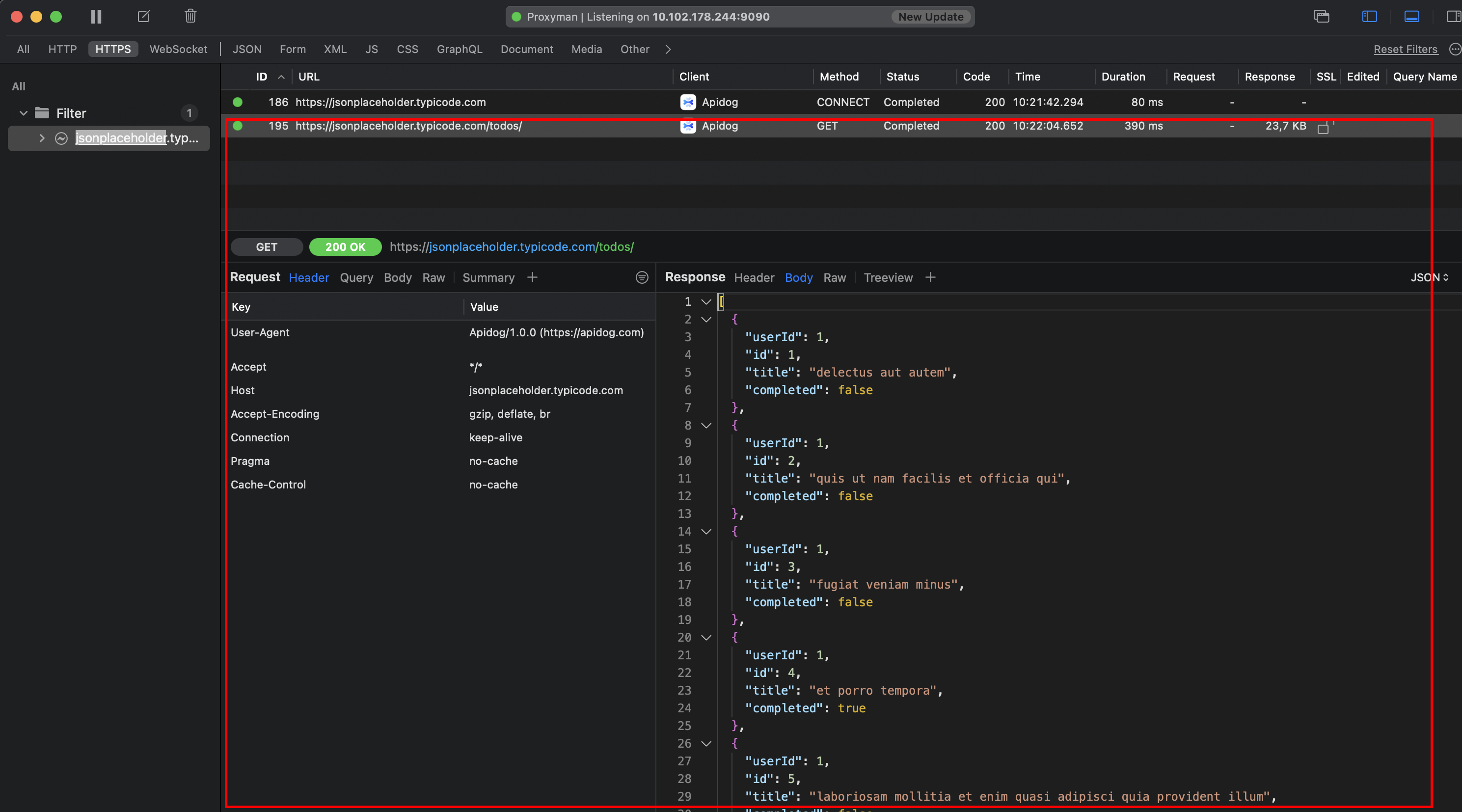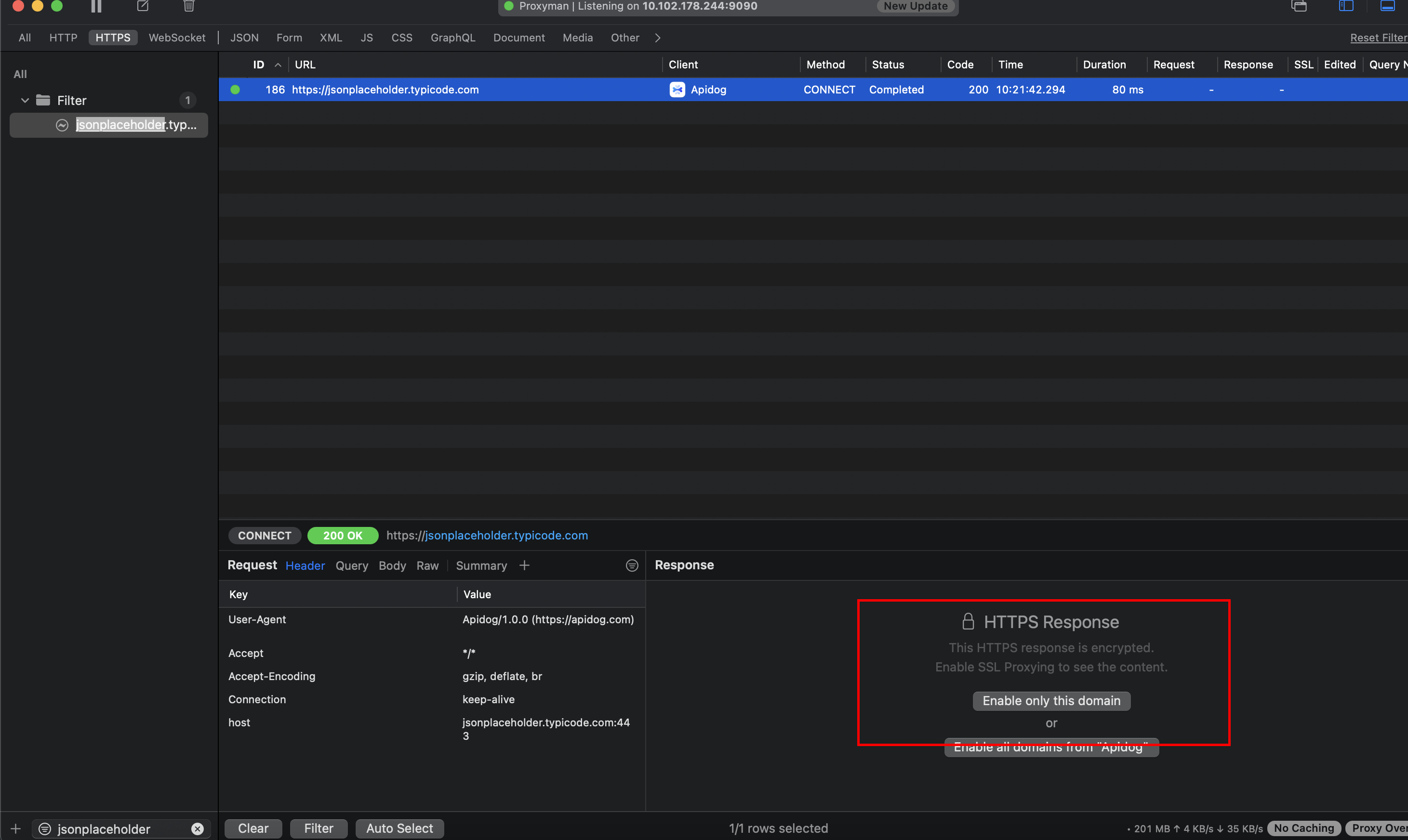 - Return to Proxyman and check the logs. You should see the request from Apidog. To avoid clutter, filter the requests to focus on Apidog's traffic.Note: At this stage, only the request is visible because SSL interception isn't enabled yet.