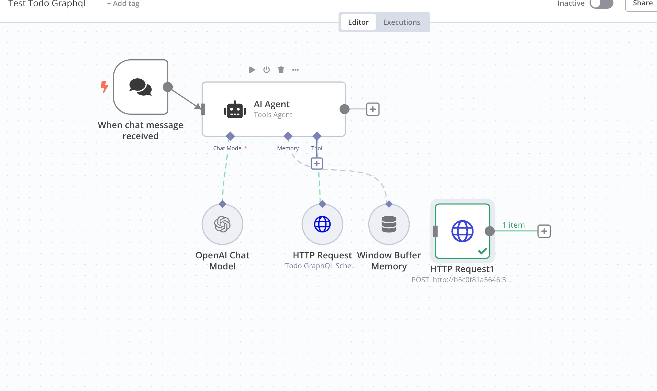 Now let's build the agent using the GraphQL Todo API. We'll create a new workflow in n8n, which should end up looking like this.