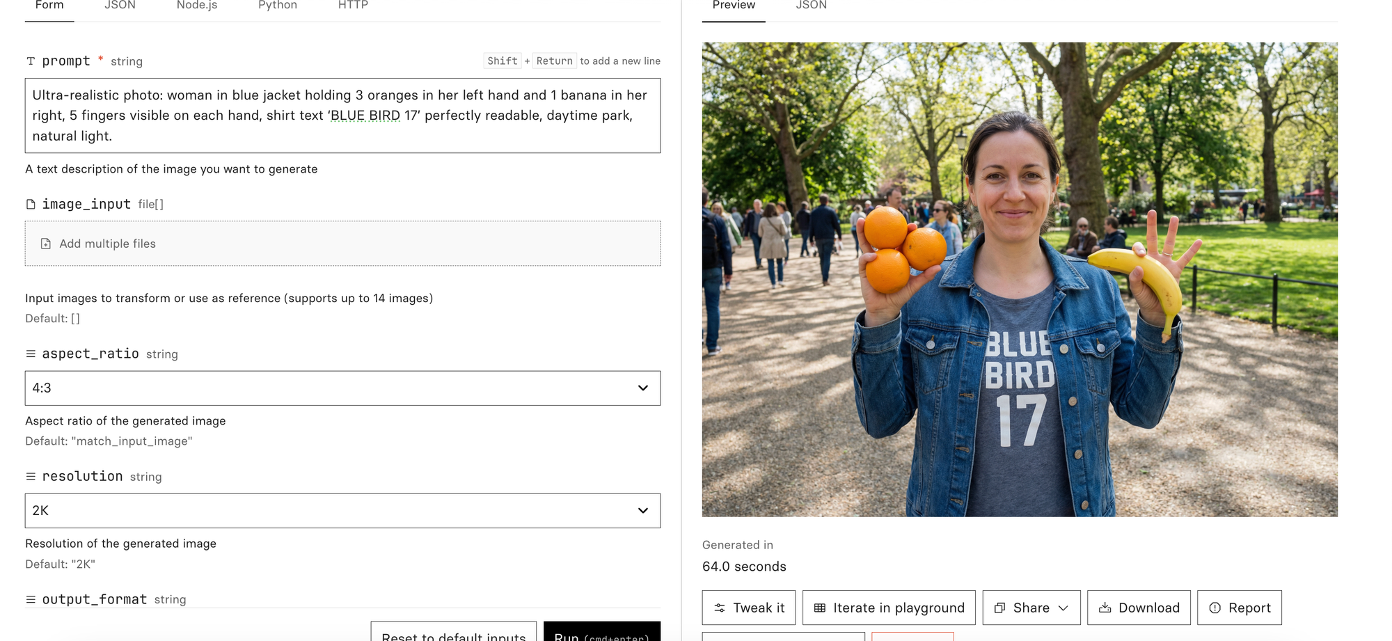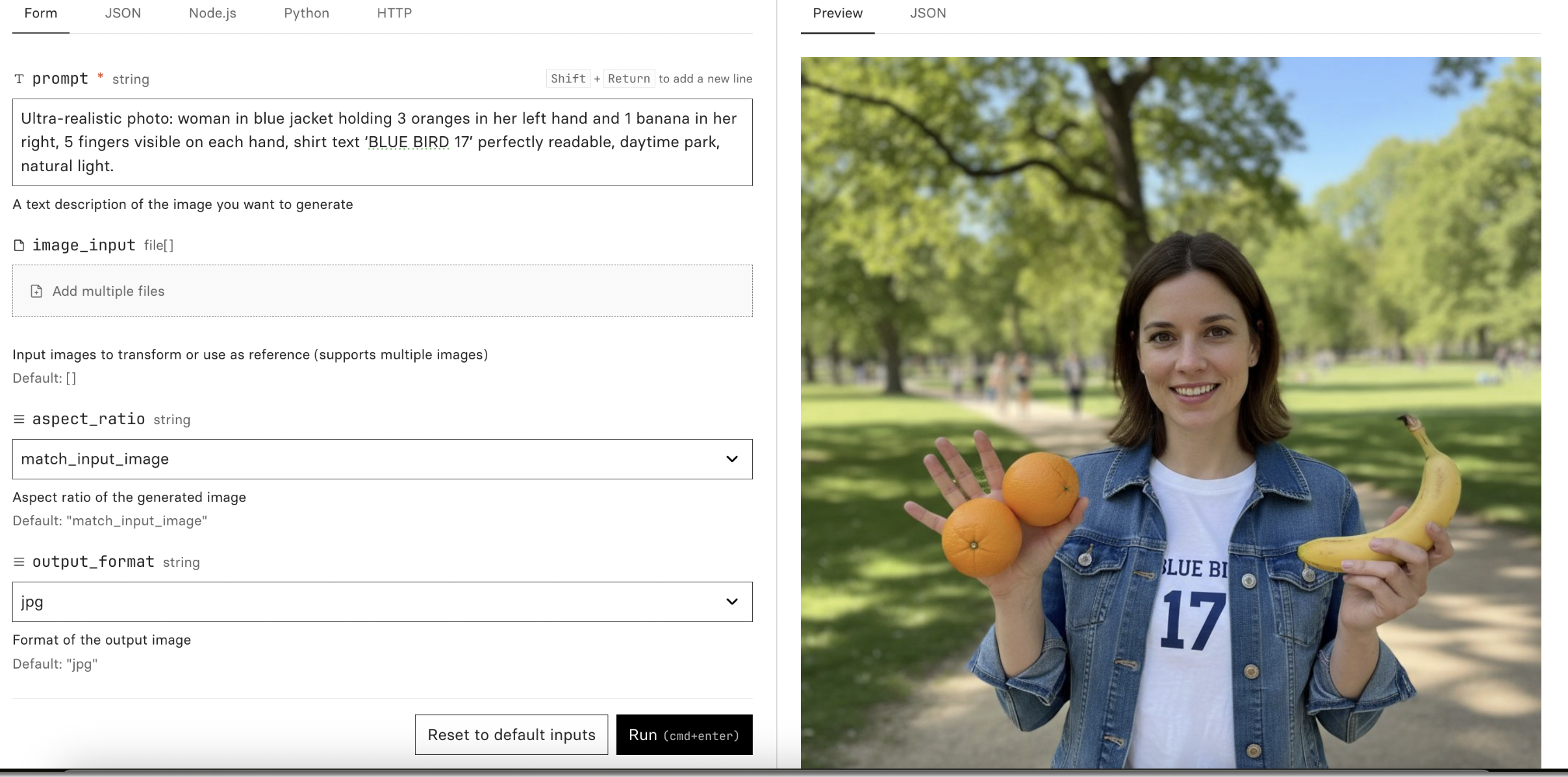Prompt: Ultra-realistic photo: woman in blue jacket holding 3 oranges in her left hand and 1 banana in her right, 5 fingers visible on each hand, shirt text ‘BLUE BIRD 17’ perfectly readable, daytime park, natural light.