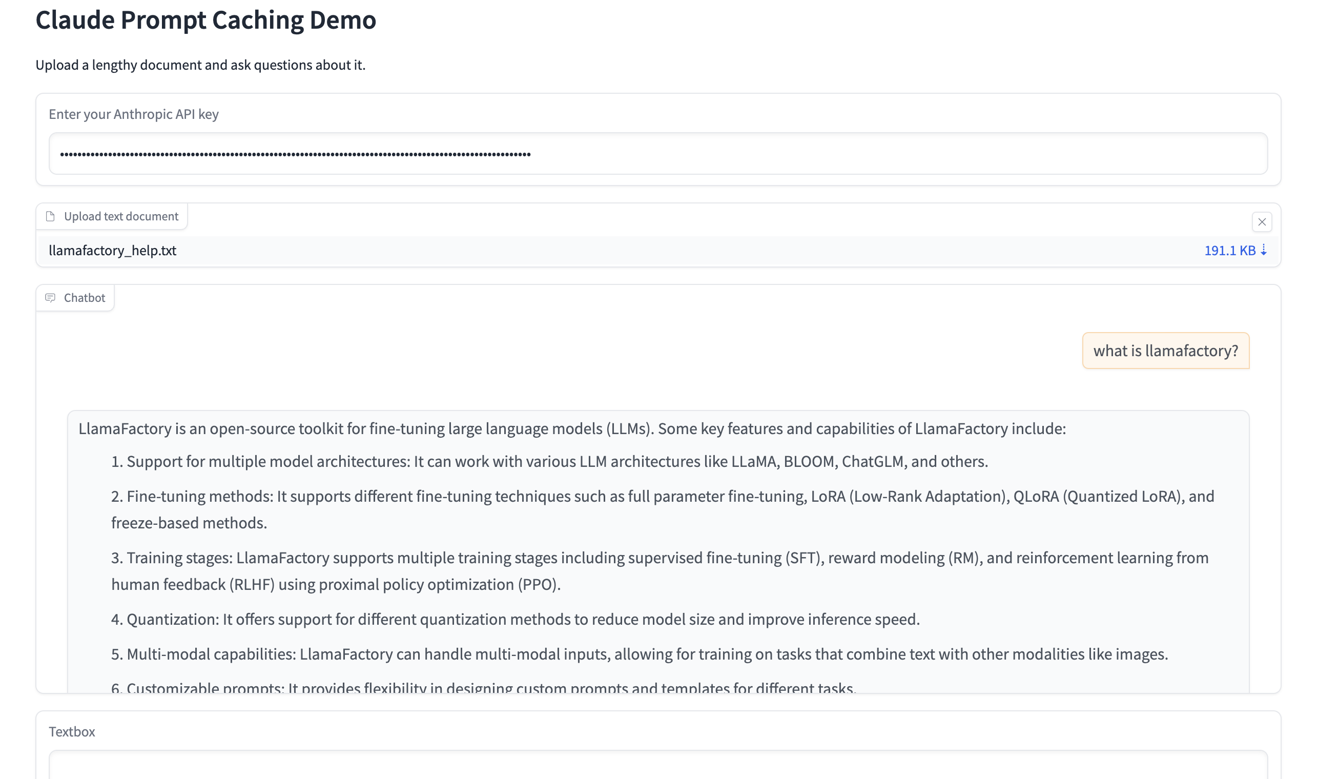In this example, I uploaded a comprehensive manual from a Github Repo (LLAMFactory) and asked some questions.
