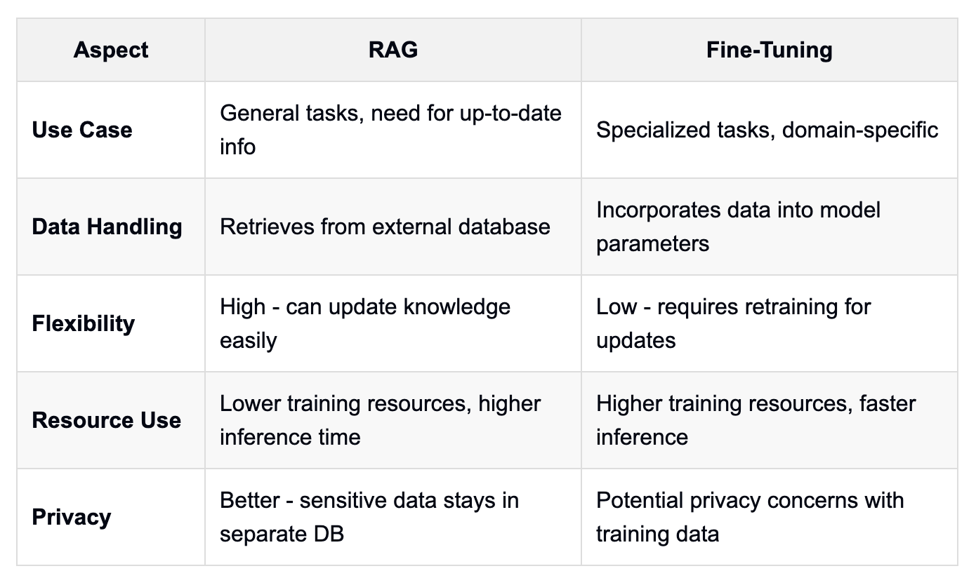 | Aspect | RAG | Fine-Tuning |