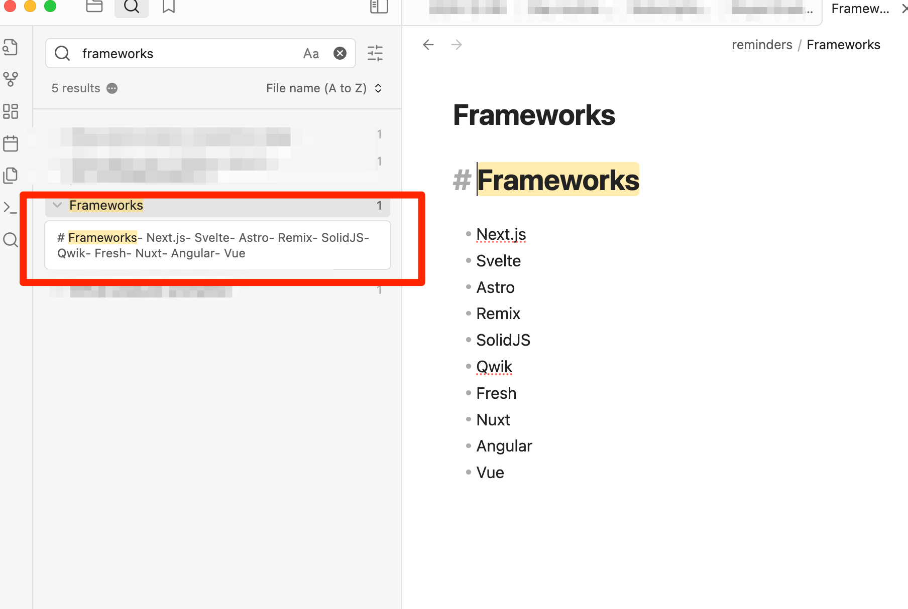 Now, if you search in Obsidian for "frameworks" (or any other synced term), you’ll see updates made in Reminders, whether on your phone or Mac.