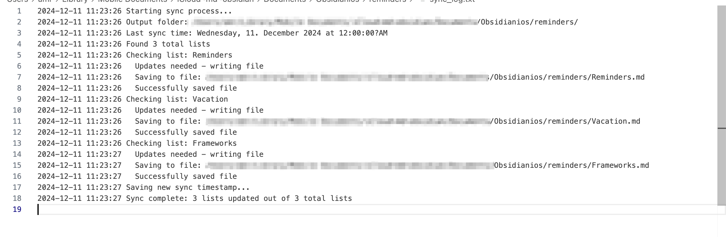 - One-way Sync: The synchronization is from Reminders to Obsidian only. Changes made in Obsidian will be overwritten during the next sync. Treat Obsidian as a read-only copy of your Reminders.