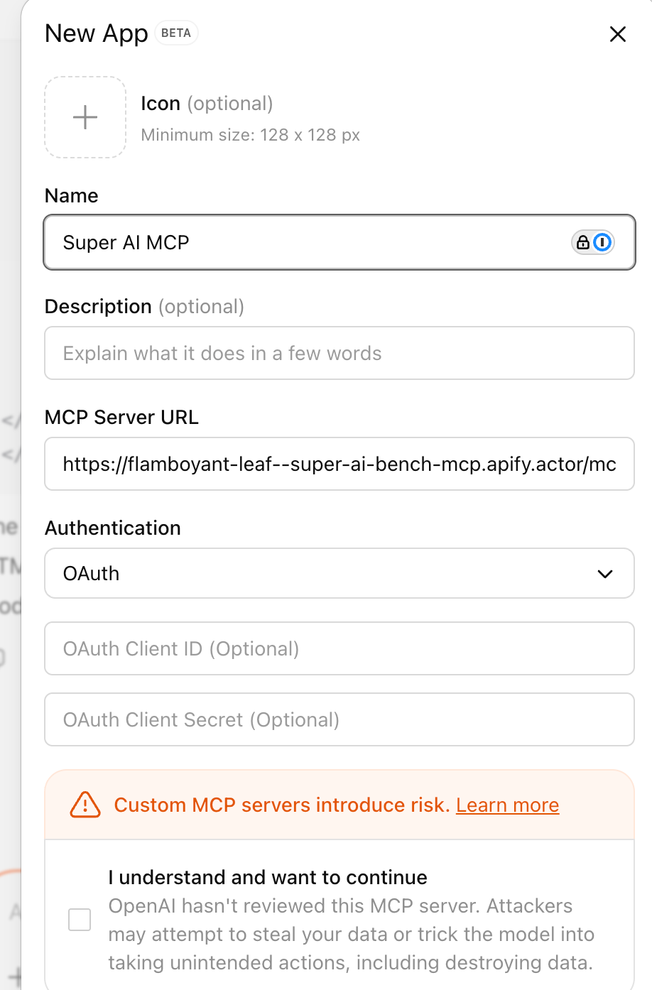 Leave the OAuth section empty, as you will authenticate with Apify later. Click confirm to save.