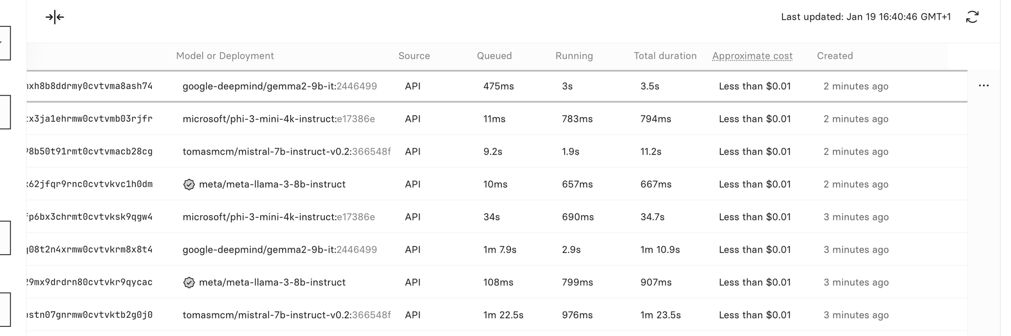 You can see the jobs running in your Replicate dashboard, with details including creation date, duration, and more. Your AI also has access to this data.