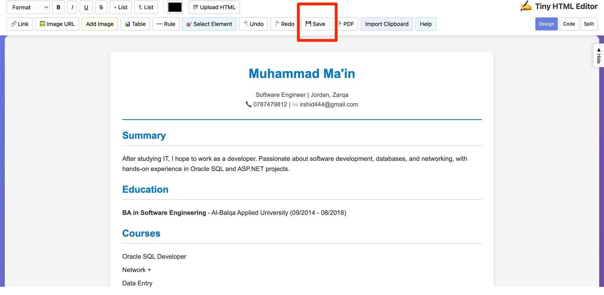 After downloading the resume, we can now upload the image and make modifications to the HTML using a simple open-source HTML editor.