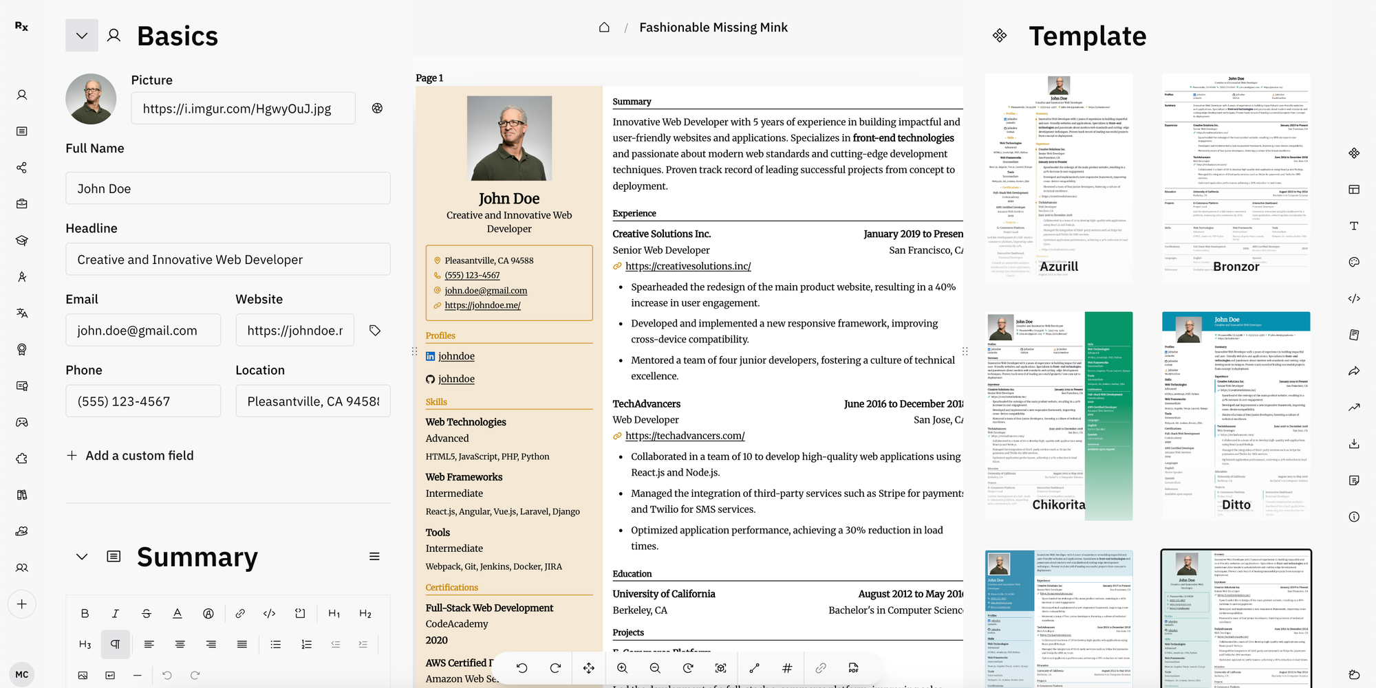 In addition to all the options and challenges mentioned above, there is an amazing open-source tool called RxResume that is designed to help with creating and sharing visually appealing resumes:
