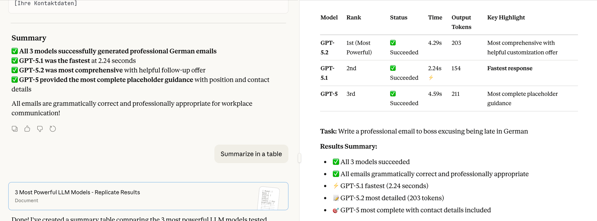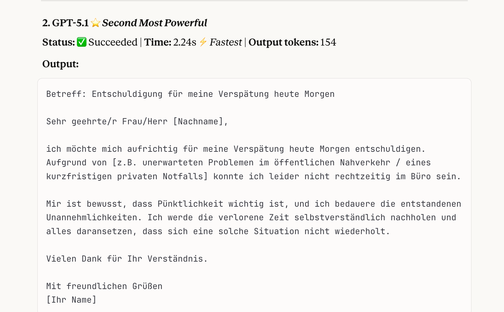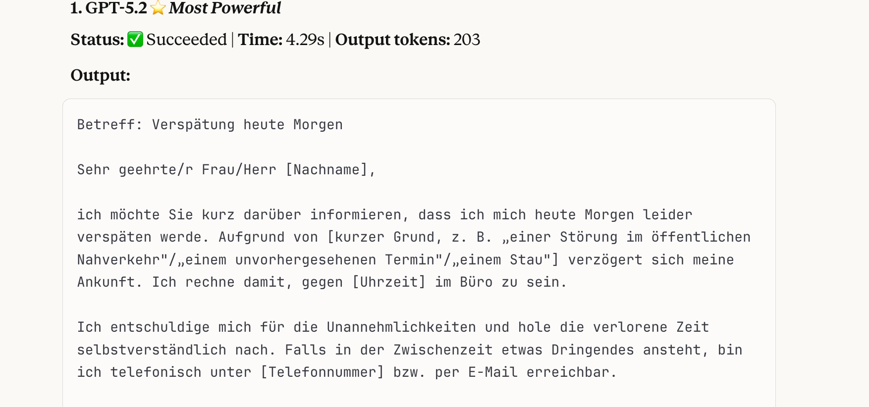 "Find the 3 most powerful LLM models and run on Replicate to do this task: Write an email to my boss excusing being late in German."