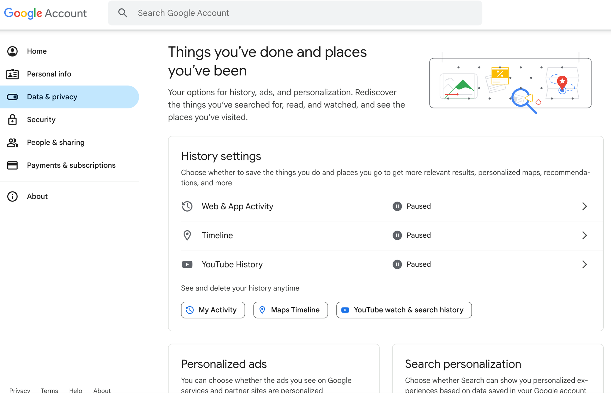 I explored my Google account's privacy settings (Google Account Privacy) but found no relevant options related to GenAI or Gemini. This experience highlighted a broader issue: privacy settings are often buried within complex hierarchies, lacking intuitive search functionality. Without clear access to privacy controls, users are left uncertain about how their data is being utilized.