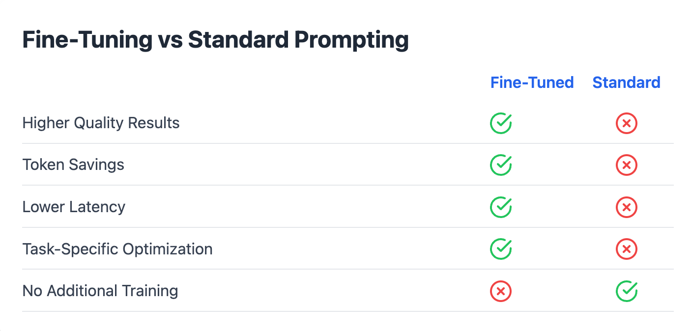 - Higher Quality Results: Fine-tuning delivers better outcomes compared to standard prompting by allowing the model to learn from a larger dataset.