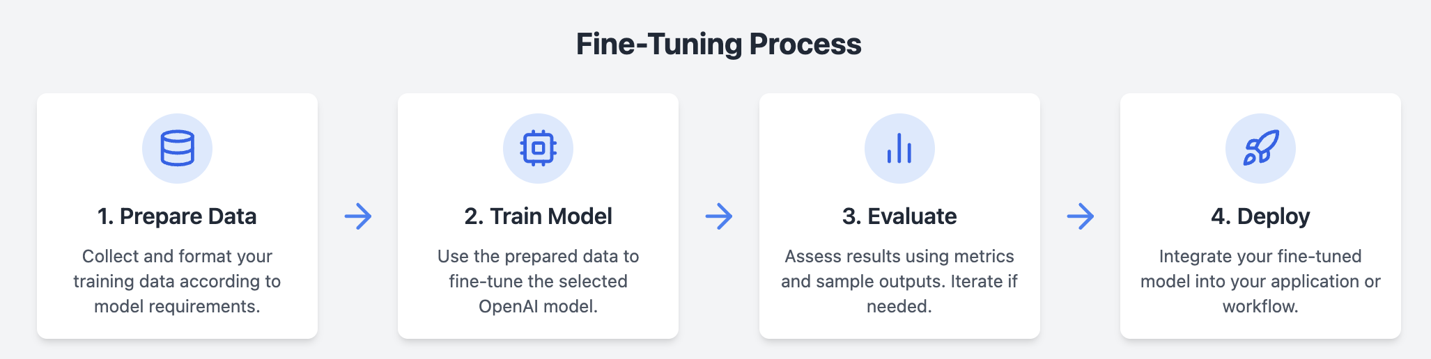 - Efficiency: Once fine-tuned, a model requires fewer examples in the prompt, reducing token usage and improving request efficiency.