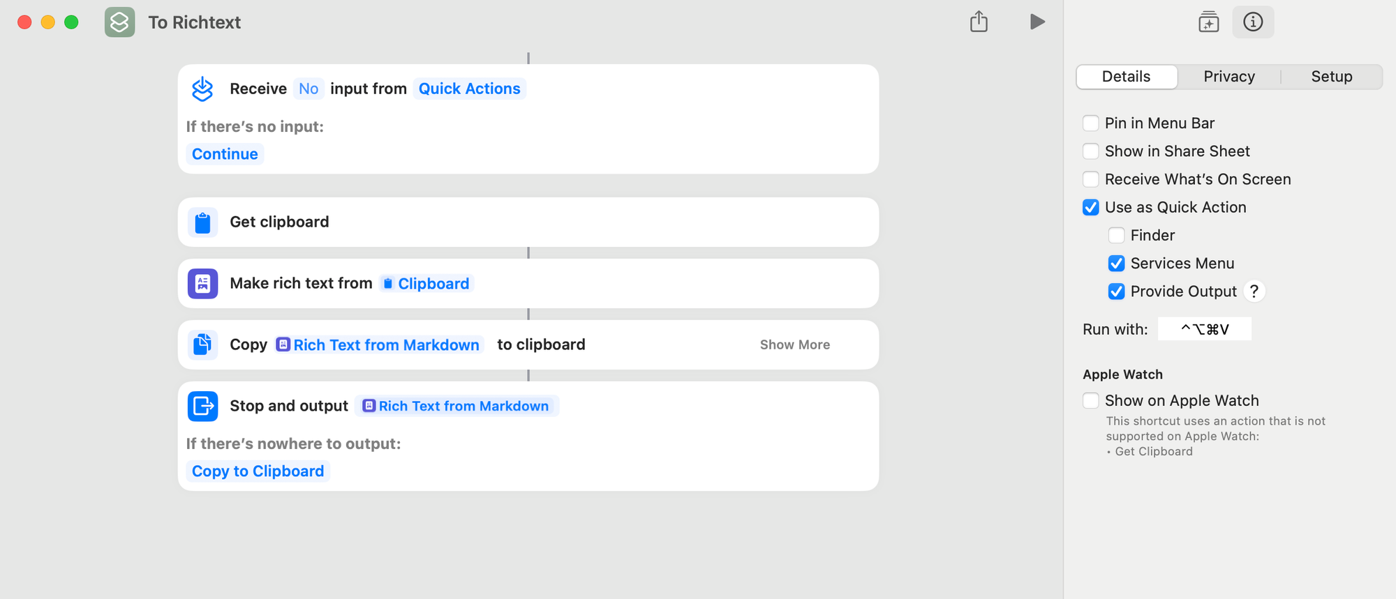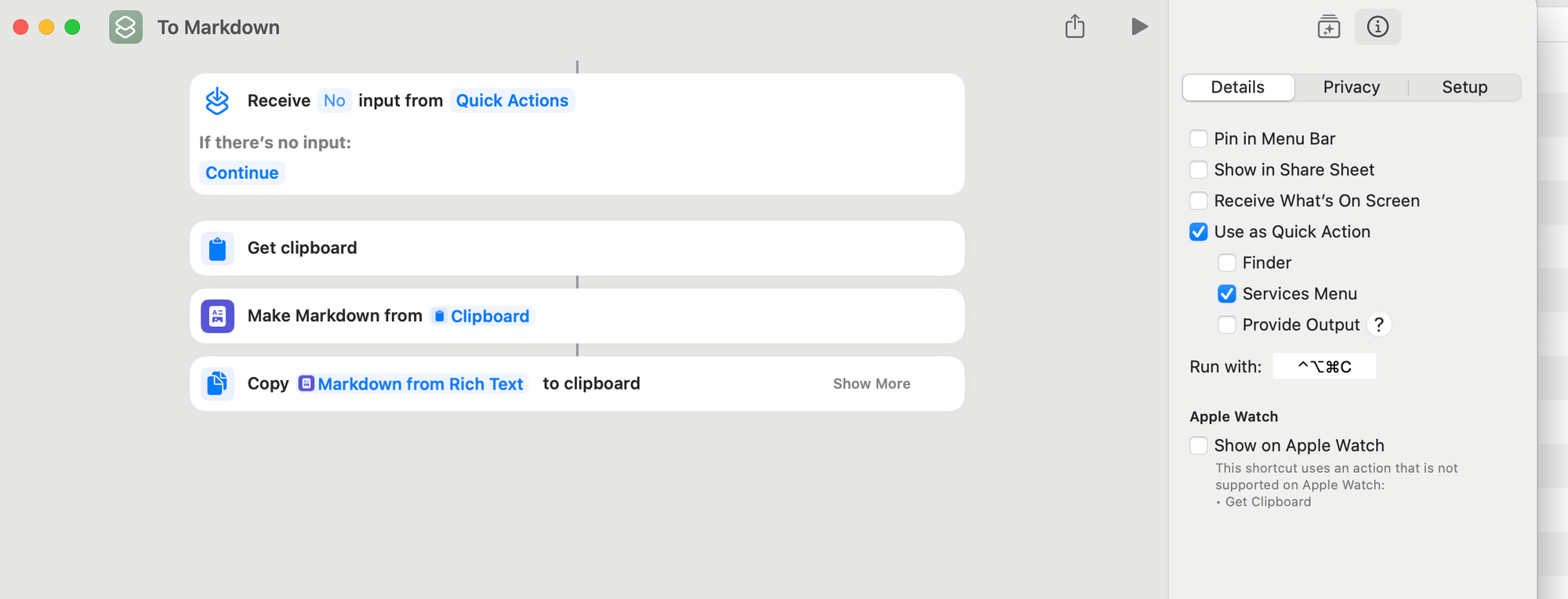 Step 2: Creating the Rich Text to Markdown Shortcut