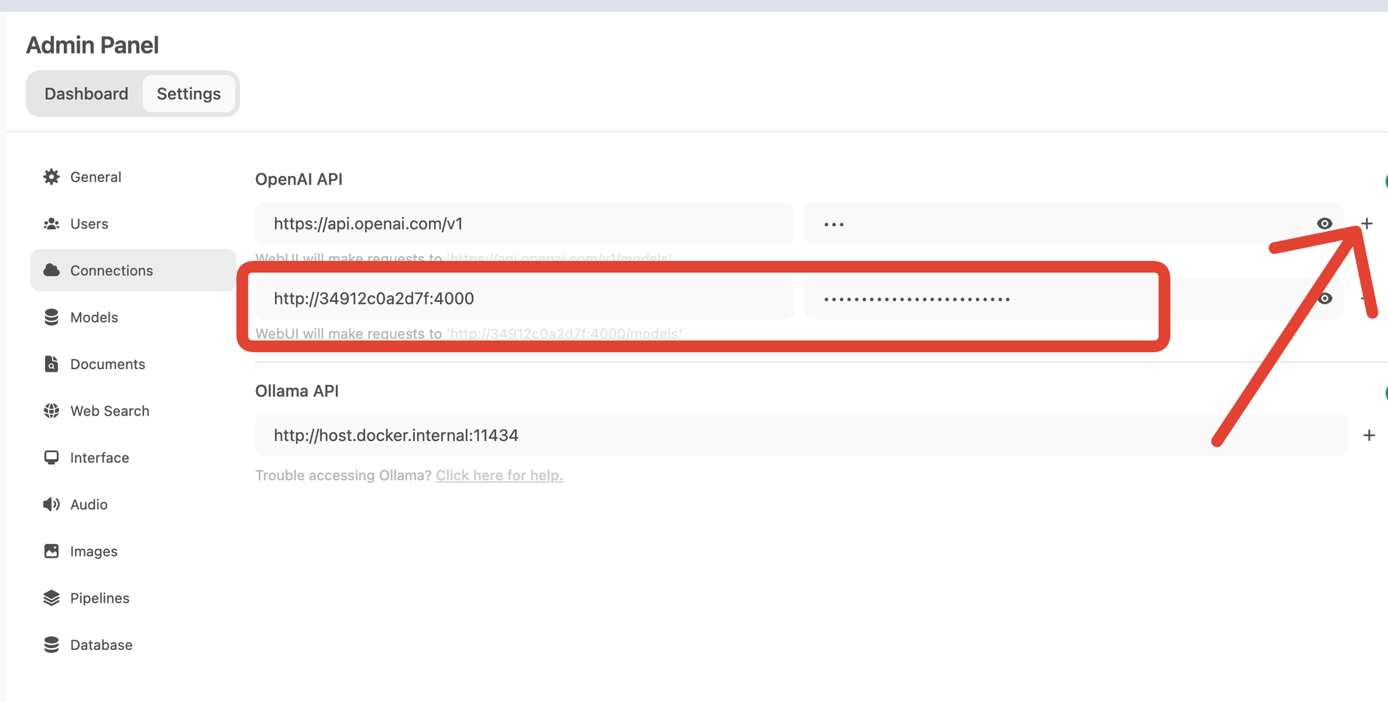 Make sure the API key you provide in OpenWebUI is valid for all models you want to use. For example, if you want to use both Claude and GPT-4, the key must allow access to both models. Otherwise, OpenWebUI will only show the models accessible with the provided API key.