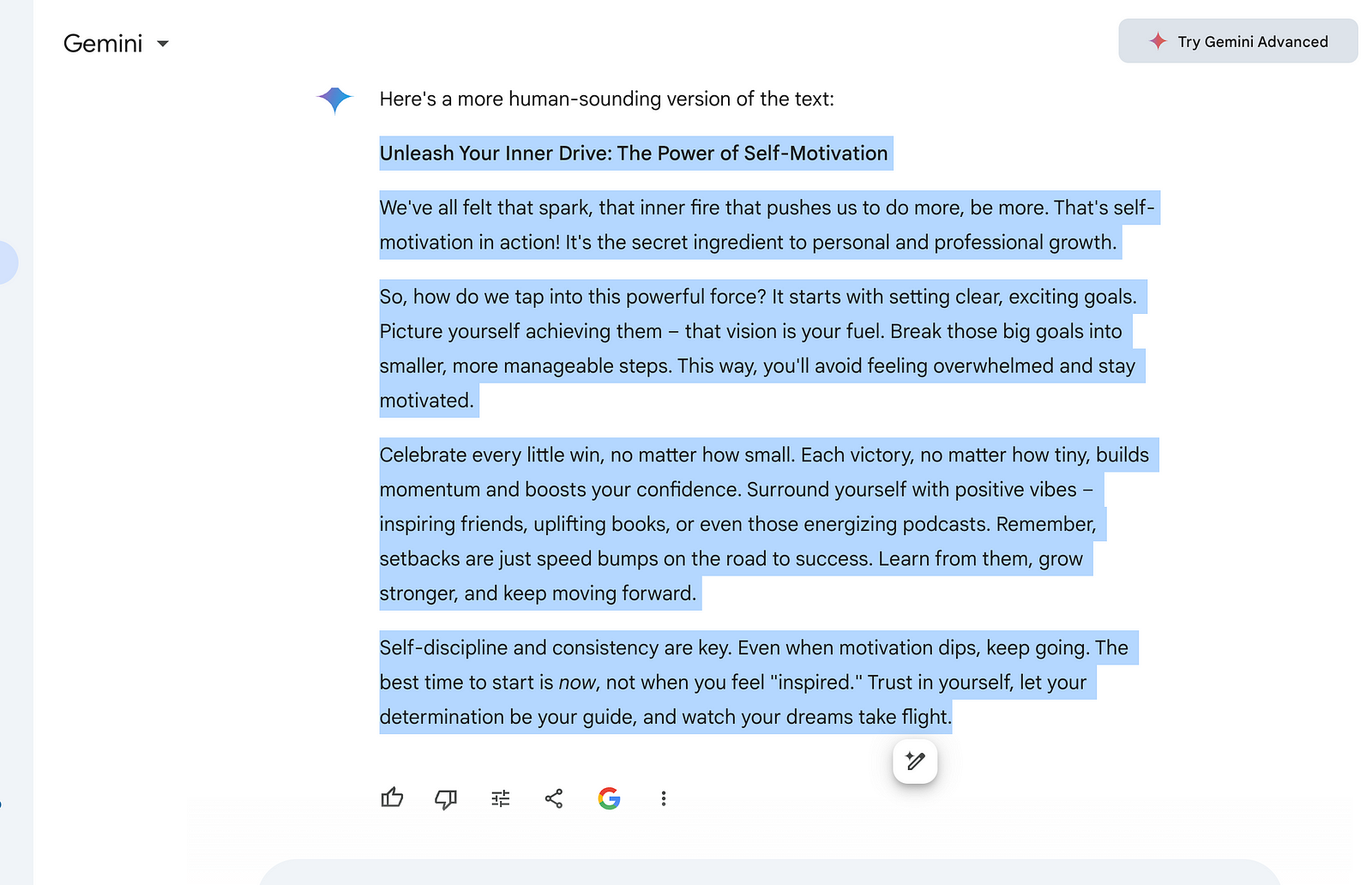 - Google Gemini scored lower, with only 2 out of 9 participants perceiving its text as human-written. Feedback suggested that while the content was informative, it lacked the natural flow and warmth of human writing.
