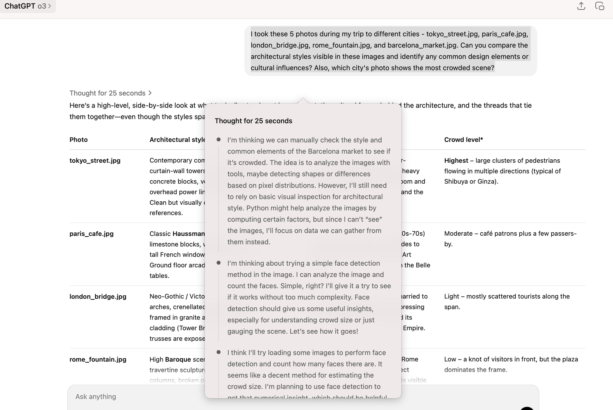 One notable point here is that the thought process sometimes reveals that it doesn't have access to the images. While this information is present in the internal workings, the final output doesn't necessarily show it. This suggests something is going wrong, but we'll get back to this later.