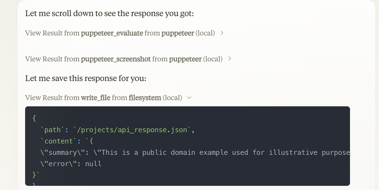 - MCP configuration and connections worked seamlessly out of the box, and Claude's interactions with them are transparent (you can follow the entire conversation with each MCP server in the chat window).