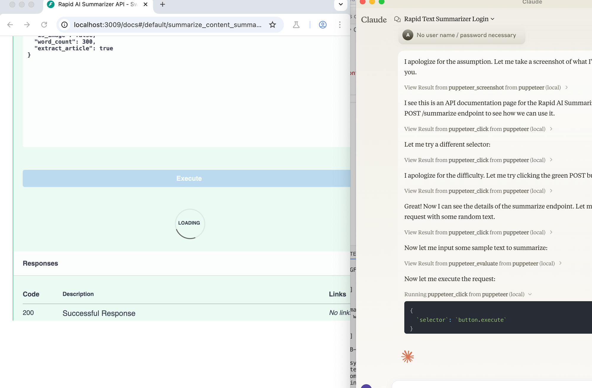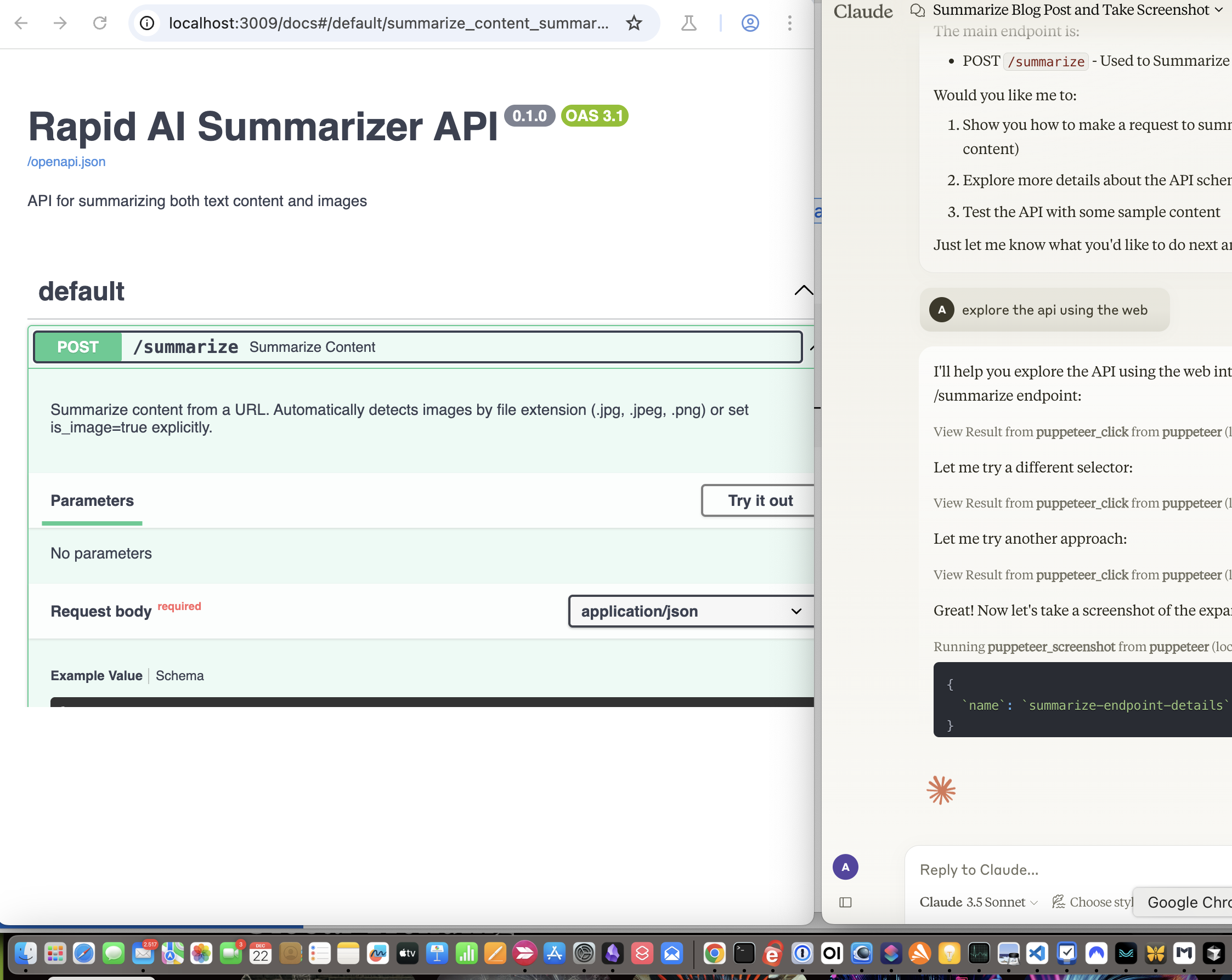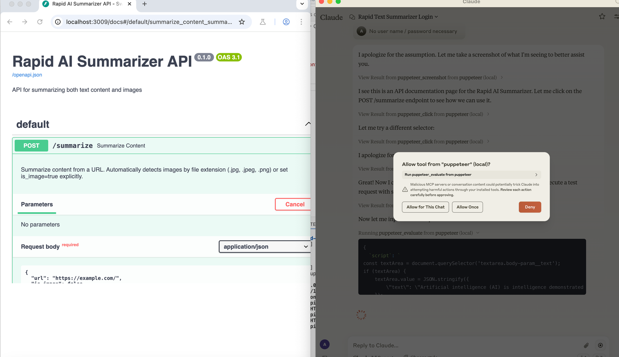 For this demonstration, the summarizer is running locally at localhost:3009. We'll use the Puppeteer MCP to navigate to the API testing interface, input a URL, trigger the summarization, and then save the result using the file system MCP.